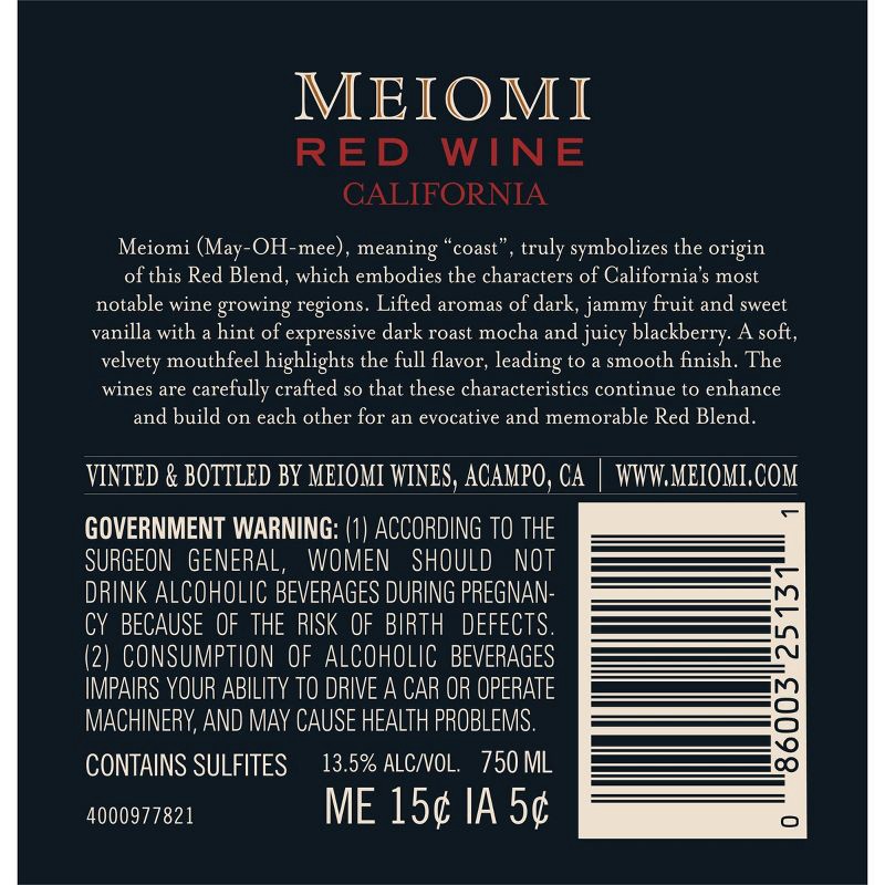 Meiomi® Red Blend red wine offers a taste of coastal California with unforgettable balance, complexity, and richness of flavor. Carefully crafted with grapes grown in California's most notable winegro…