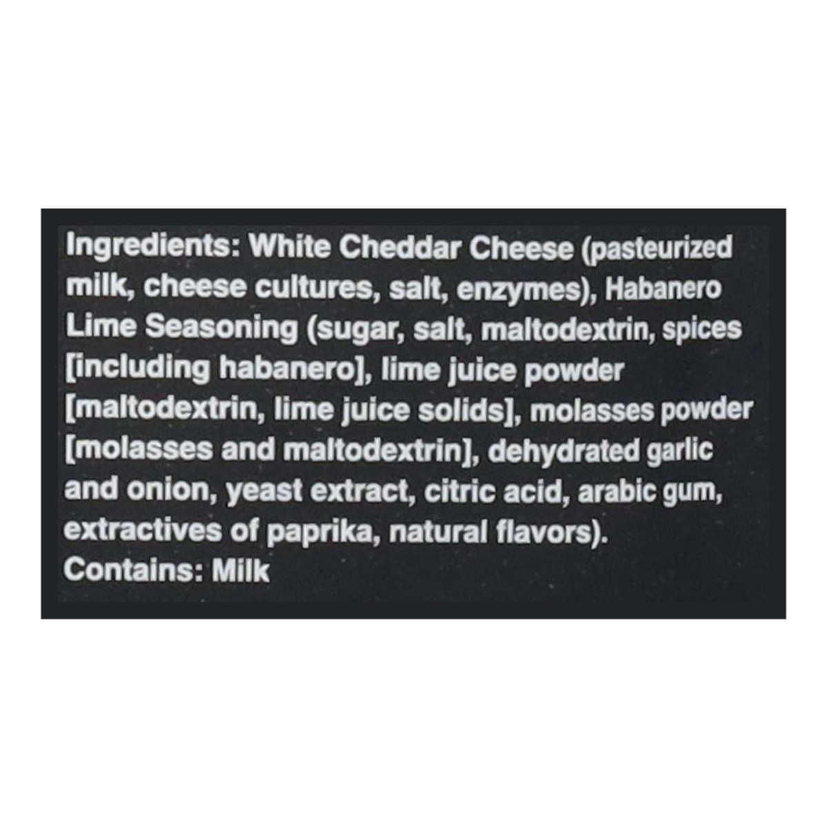 White Cheddar Cheese (Pasteurized Milk, Cheese Cultures, Salt, Enzymes), Habanero Lime Seasoning (Sugar, Salt, Maltodextrin, Spices [Including Habanero], Lime Juice Powder [Maltodextrin, Lime Juice So…