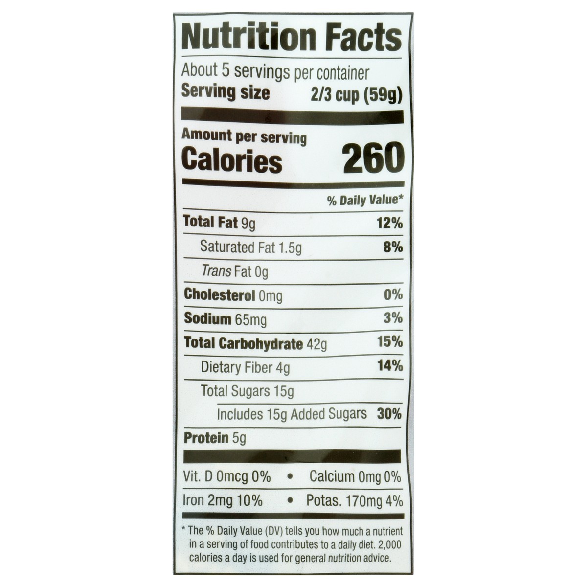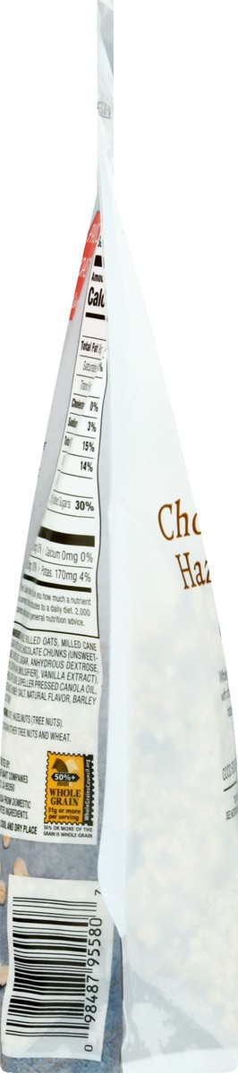 Whole grain rolled oats with chocolate chunks, hazelnuts & honey. Contains 9 g total fat per serving. 50%+ Whole Grain: 31 g or more per serving. 50% or more of the grain is whole grain. WholeGrainsCo…