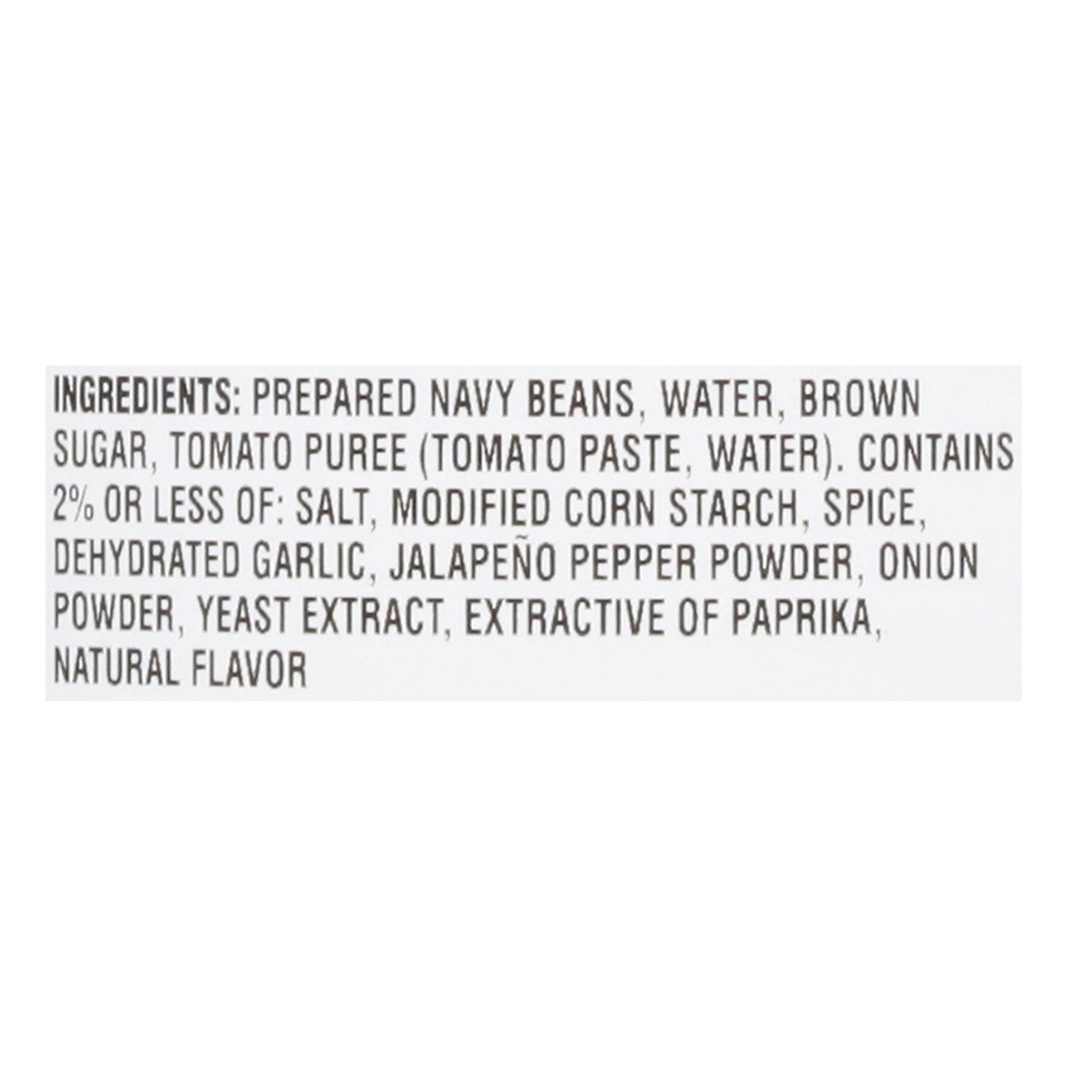 Prepared Navy Beans, Water, Brown Sugar, Tomato Puree (Tomato Paste, Water). Contains 2% or less of: Salt, Modified Corn Starch, Spice, Dehydrated Garlic, Jalapeño Pepper, Onion Powder, Yeast Extract,…