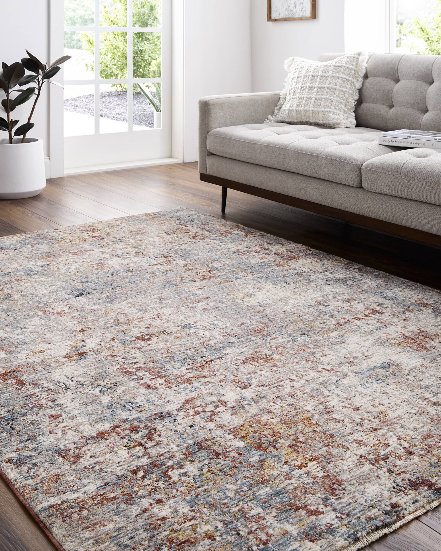 Polyester stain-resistant, making it perfect for high traffic areas. Distressed abstract pattern in shades of blue, rust, and ivory adds vintage-inspired charm. 0.35 in pile height provides a comforta…