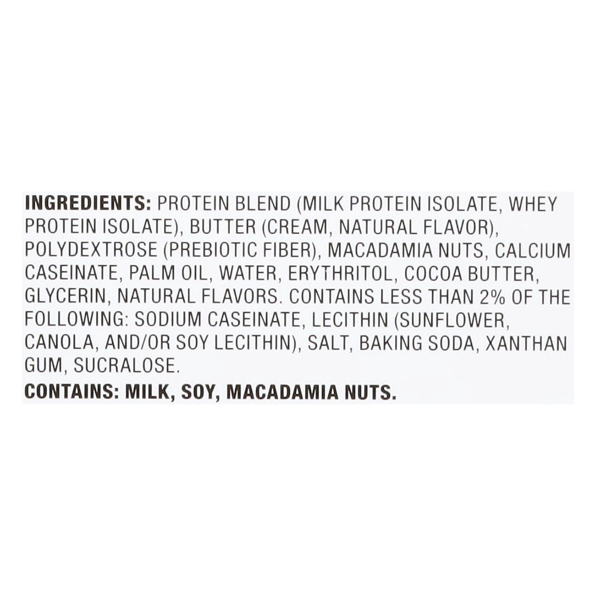 Protein Blend (Milk Protein Isolate, Whey Protein Isolate), Butter (Cream, Natural Flavor), Polydextrose (Prebiotic Fiber), Macadamia Nuts, Calcium Caseinate, Palm Oil, Water, Erythritol, Cocoa Butter…