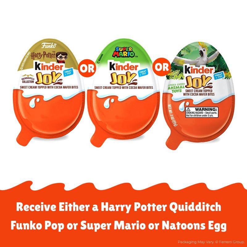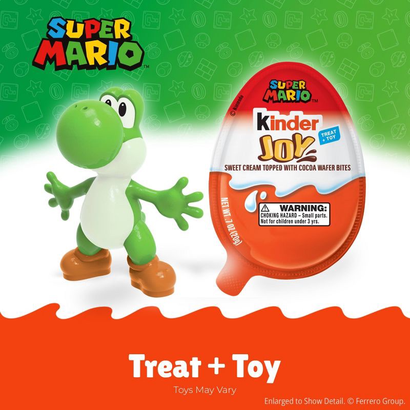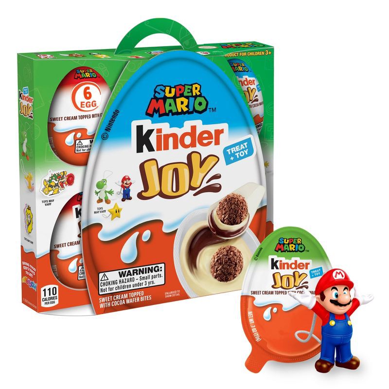 - SUPER MARIO KINDER JOY: 6 eggs filled with milky sweet creams and 2 crispy wafer bites, with a surprise Super Mario toy inside, all in a 4.2 oz pack