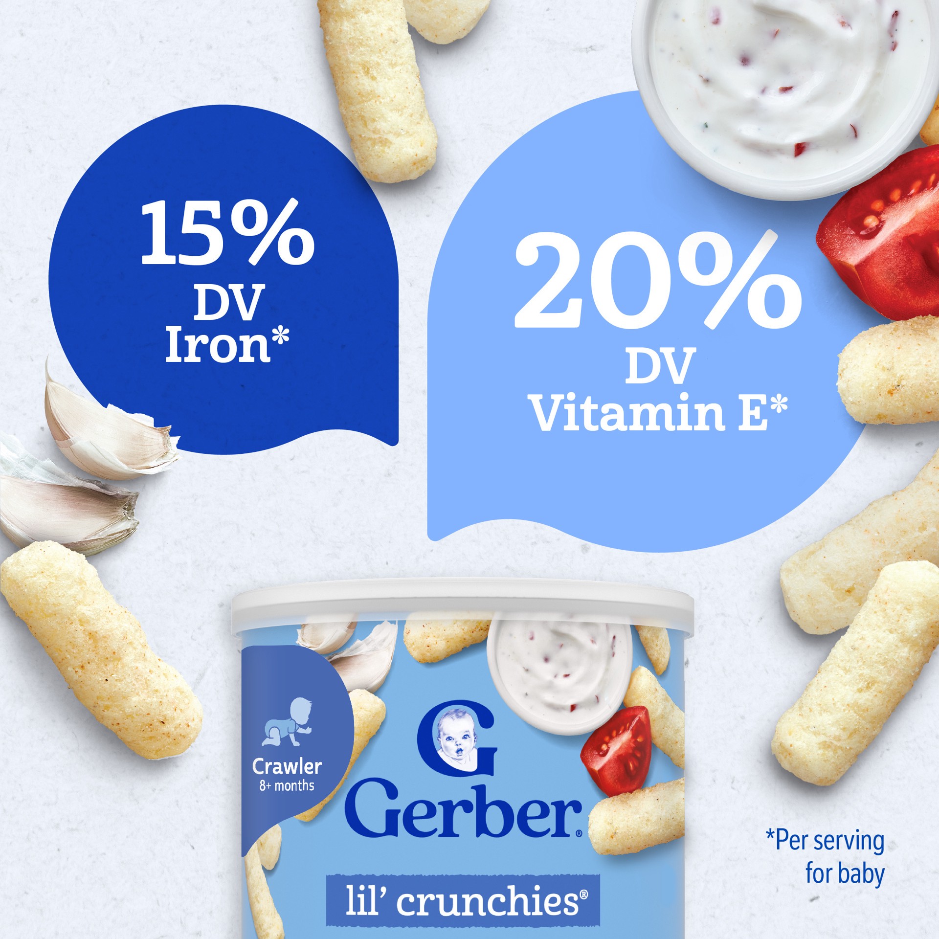 Gerber Lil' Crunchies baby snacks are made with wholesome ingredients and strict quality standards just for babies. This baby finger food dissolves easily and is perfect for little hands learning to p…