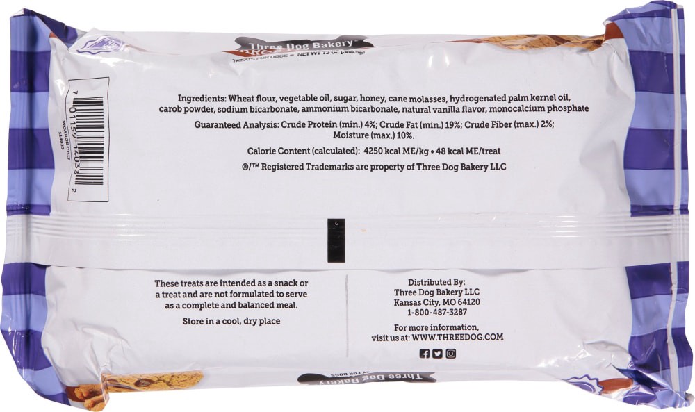 Calorie Content (Calculated): 4250 kcal ME/kg; 48 kcal ME/treat. No artificial flavors. The original bakery. Est. 1989. Real ingredients. www.threedog.com. Facebook. Twitter. Instagram. For more infor…