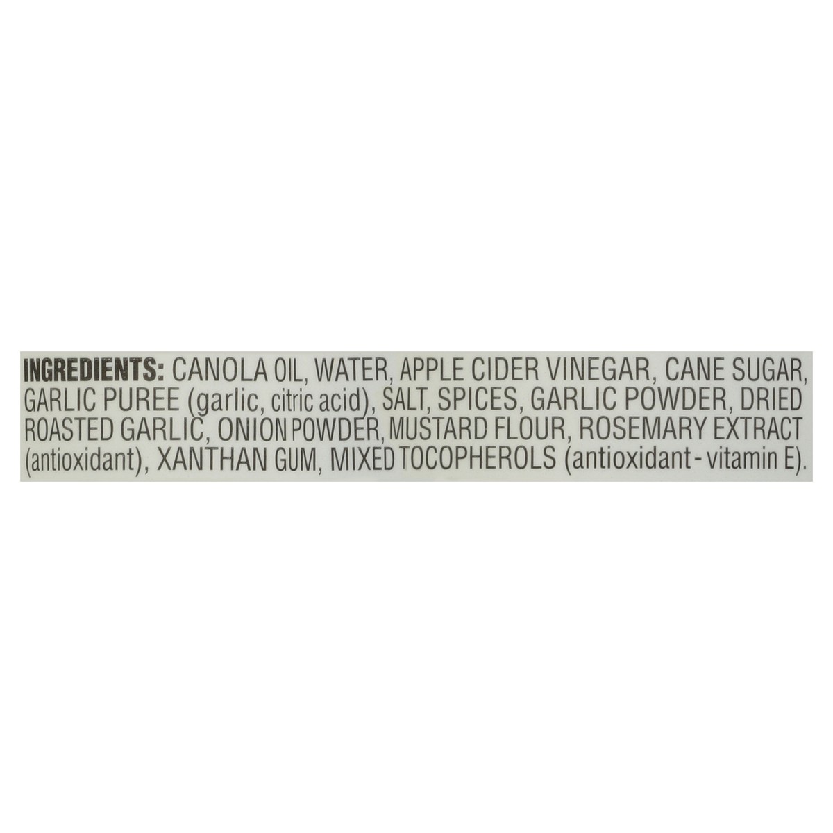 Canola Oil, Water, Apple Cider Vinegar, Cane Sugar, Garlic Puree (Garlic, Citric Acid), Salt, Spices, Garlic Powder, Dried Roasted Garlic, Onion Powder, Mustard Flour, Rosemary Extract (Antioxidant), …