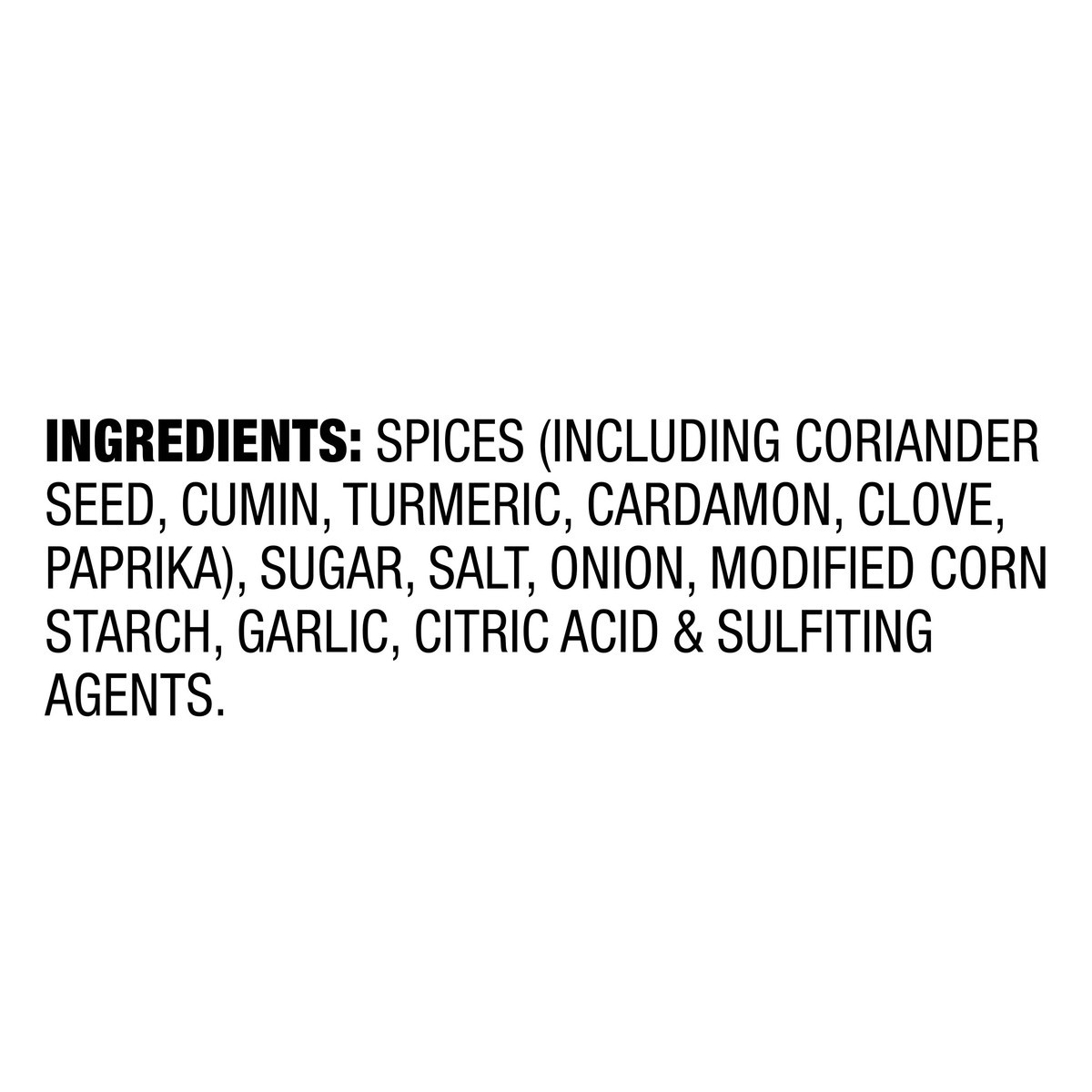 Spices (Including Coriander Seed, Cumin, Turmeric, Cardamon, Clove, Paprika), Sugar, Salt, Onion, Modified Corn Starch, Garlic, Citric Acid & Sulfiting Agents.