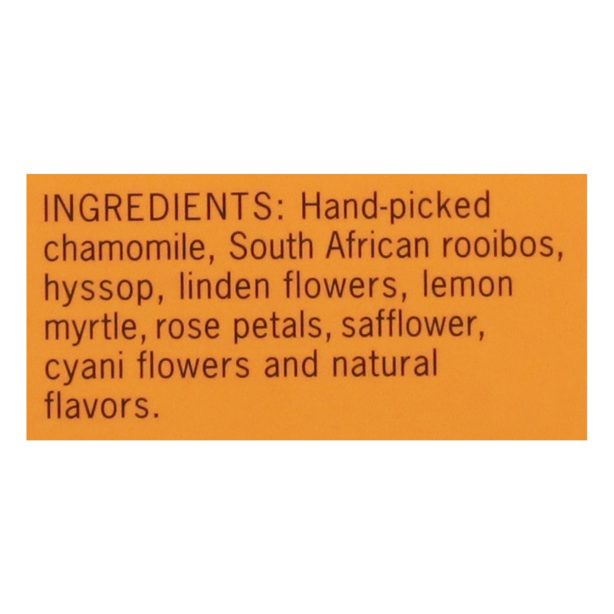 Hand-Picked Chamomile, South African Rooibos, Hyssop, Linden Flowers, Lemon Myrtle, Rose Petals, Safflower, Cyani Flowers and Natural Flavors.