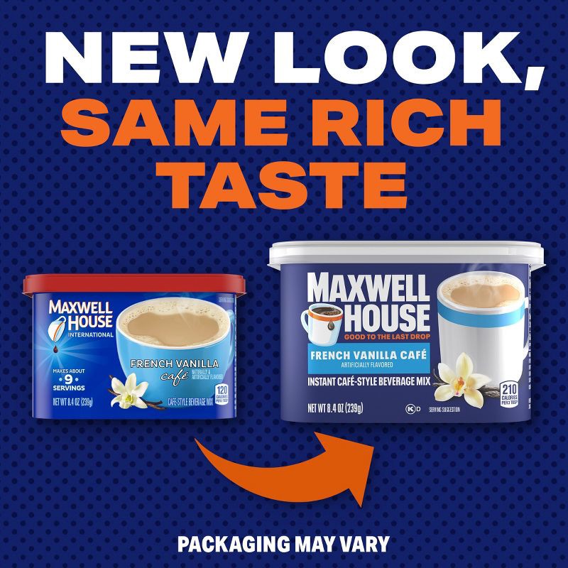 - MAXWELL HOUSE CAFE-STYLE COFFEE DRINK: One 8.4 oz canister of Maxwell House French Vanilla Cafe Instant Cafe-Style Beverage Mix