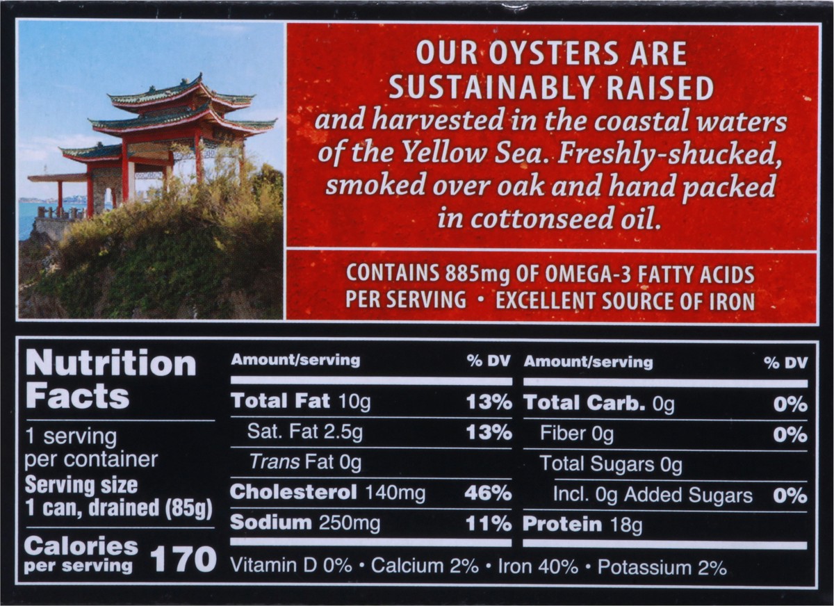 Fancy whole - packed in cottonseed oil. Our oysters are sustainably raised and harvested in the coastal waters of the Yellow Sea. Freshly-shucked, smoked over oak and hand packed in cottonseed oil. Ha…