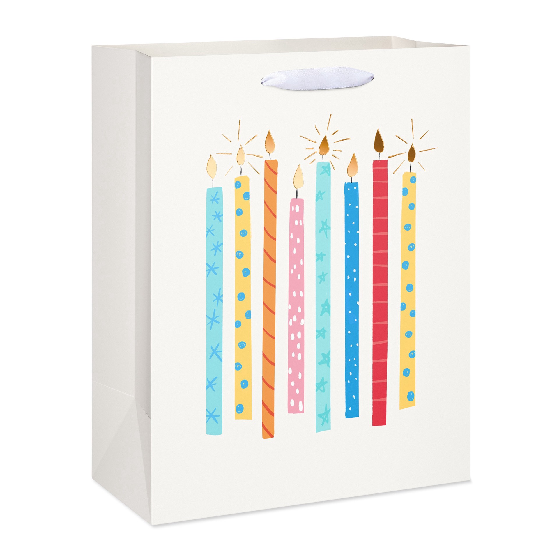 Bundle up a surprise with this large gift bag! The bag's colorful design features an array of lit candles on an off-white background, making it appropriate to gift to anyone of any age. Satin-ribbon h…