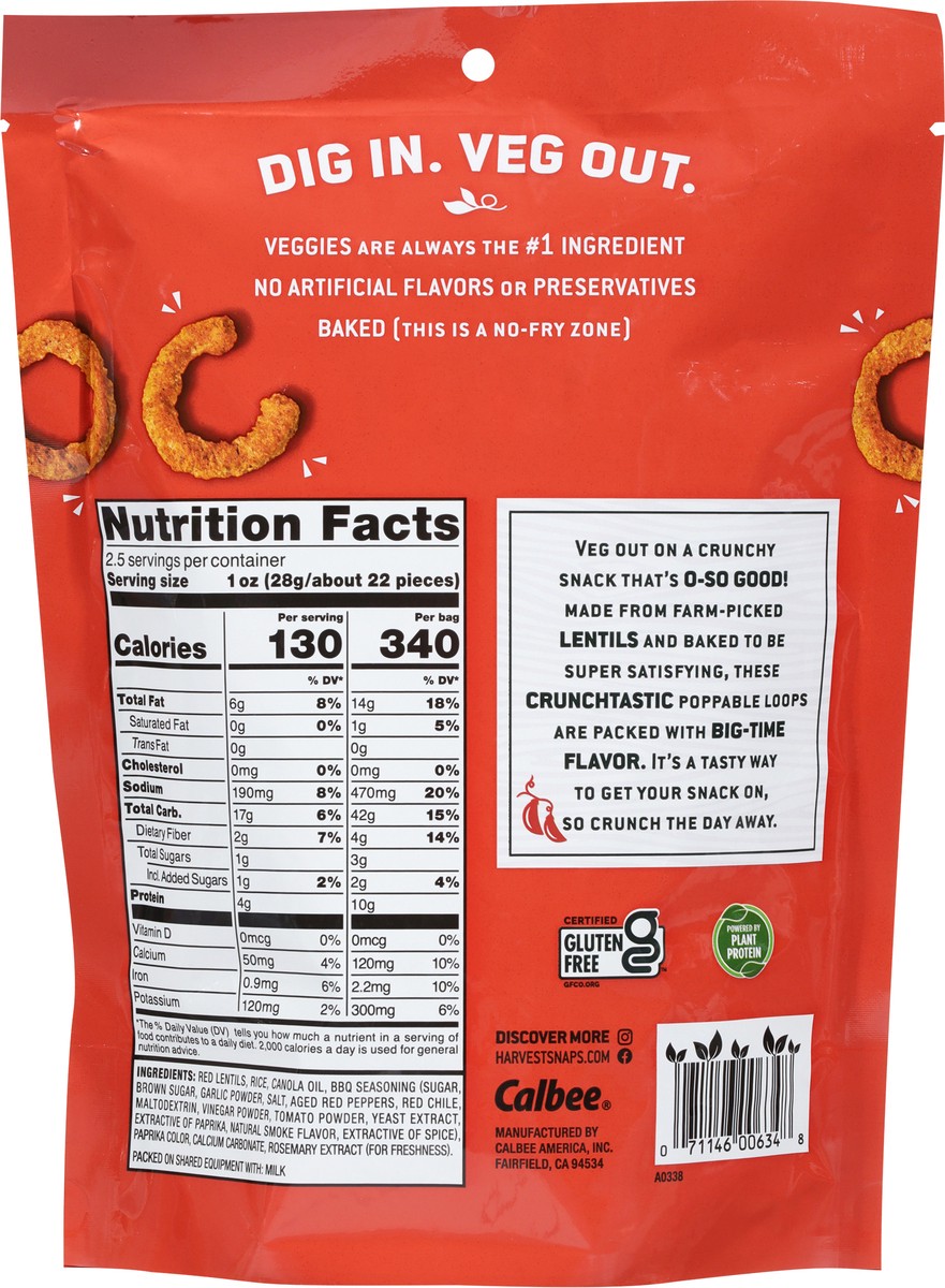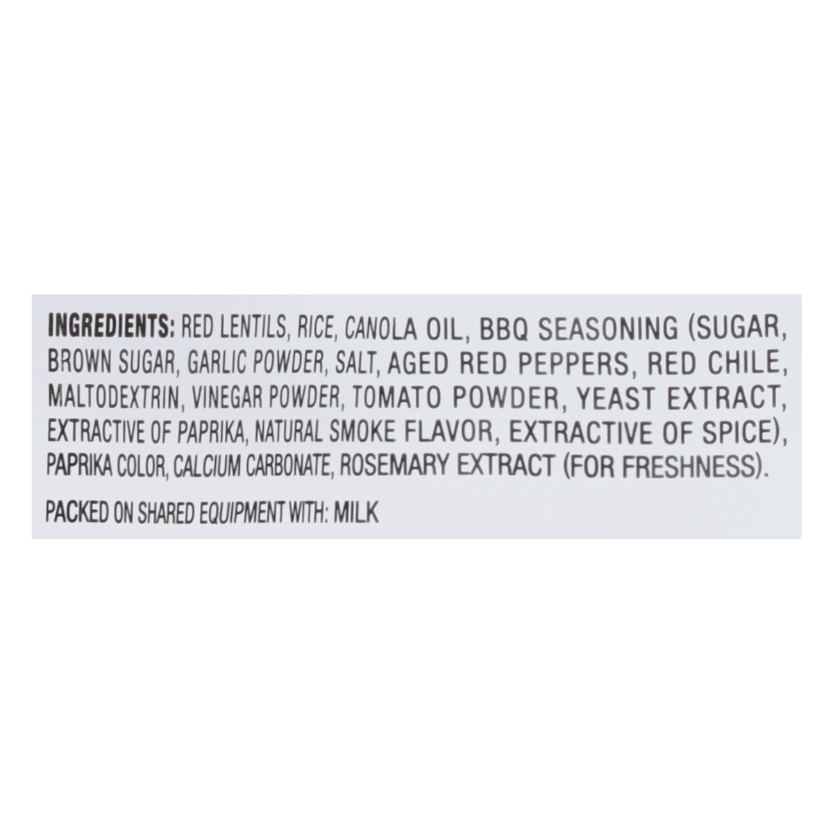 Red Lentils, Rice, Canola Oil, BBQ Seasoning (Sugar, Brown Sugar, Garlic Powder, Salt, Aged Red Peppers, Red Chile, Maltodextrin, Vinegar Powder, Tomato Powder, Yeast Extract, Extractive of Paprika, N…