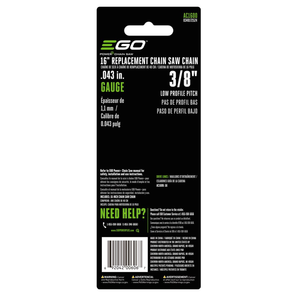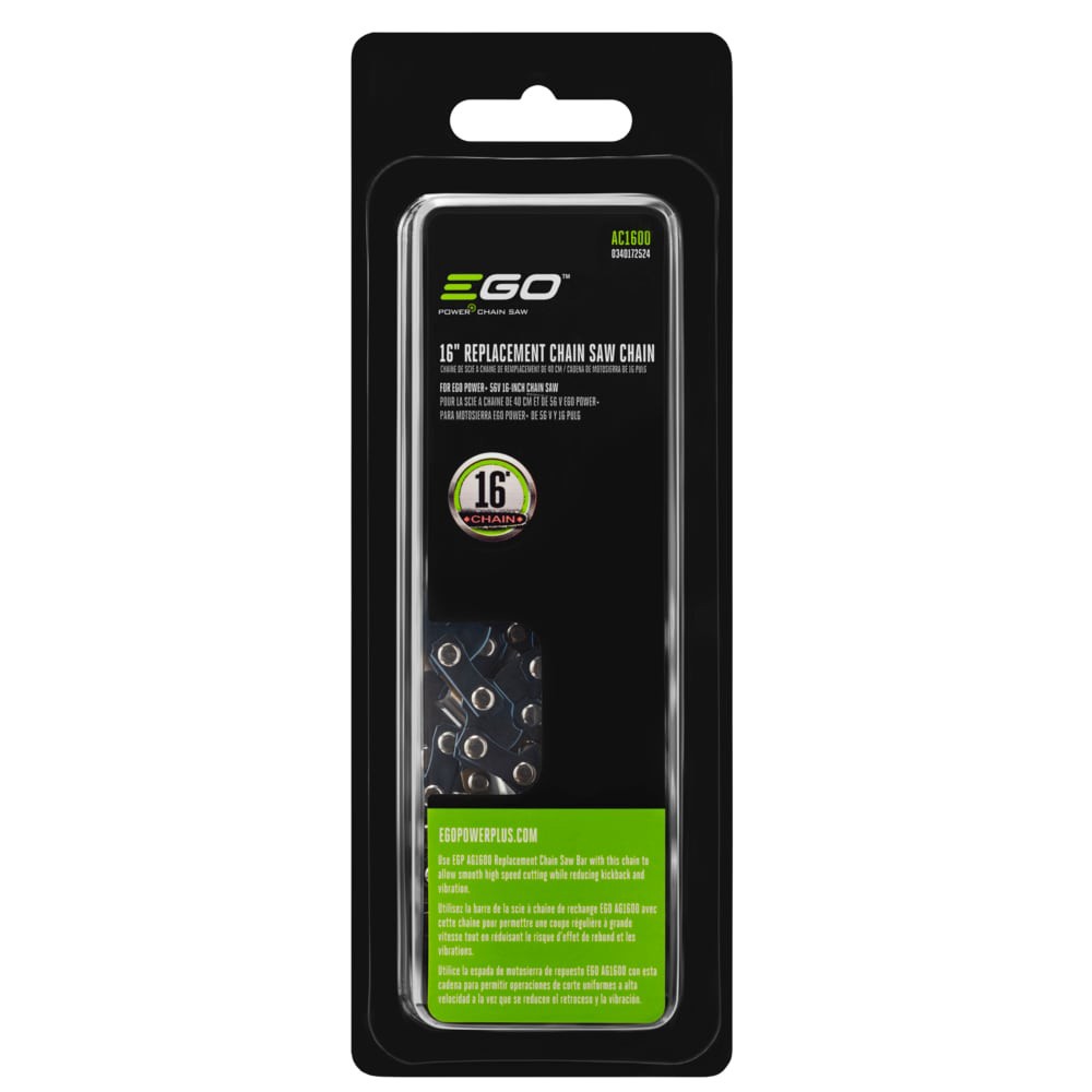 Replacement chain for EGO POWER+ 16-in Chain Saw. Low Kickback Chain Design. 0.043-in Gauge Chain with 3/8-in Low Pro Pitch. Genuine EGO parts ensure compatibility, quality and performance.