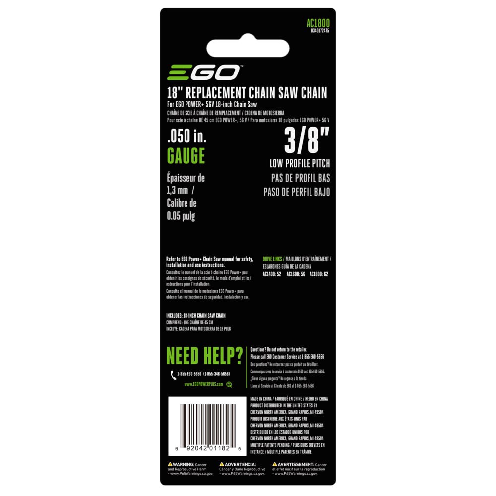 Replacement chain for POWER+ 18-in Chain Saw (CS1800). Low kickback design. 0.050-in Gauge. 3/8-in low pro pitch. Genuine EGO parts ensure compatibility, quality and performance.