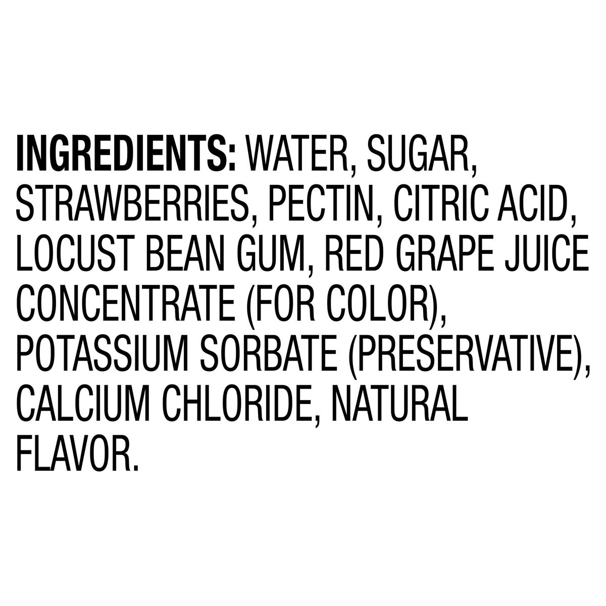 Water, Sugar, Strawberries, Pectin, Citric Acid, Locust Bean Gum, Red Grape Juice Concentrate (for Color), Potassium Sorbate (Preservative), Calcium Chloride, Natural Flavor.