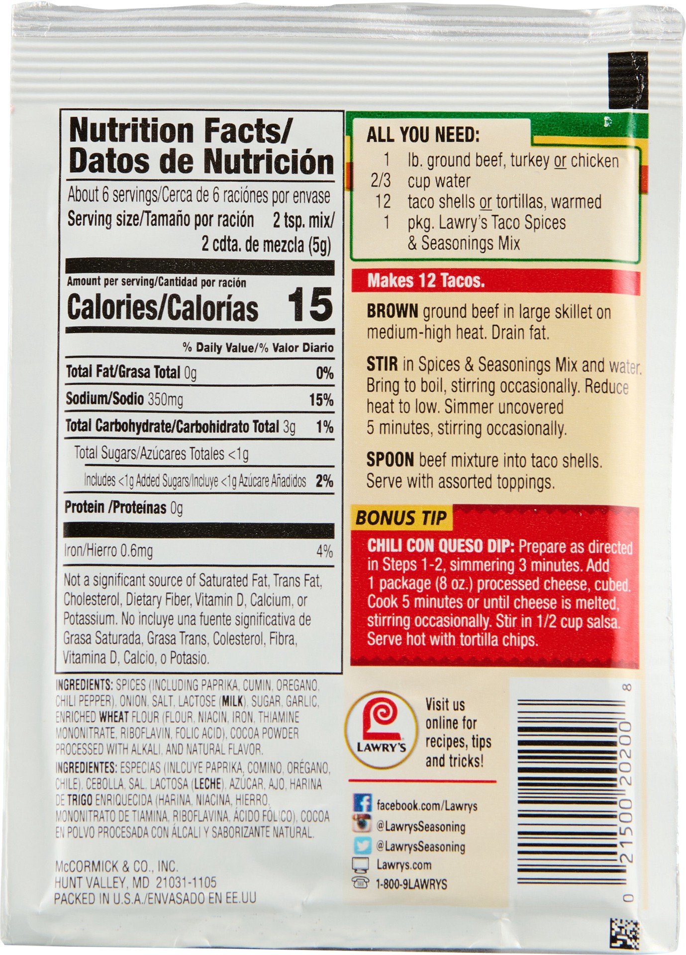 Lawry's Taco Spices & Seasonings Mix features a blend of onion, garlic, and spices such as paprika, cumin, oregano, and chili pepper to transform weeknight dinners or weekend get-togethers into fun-fi…