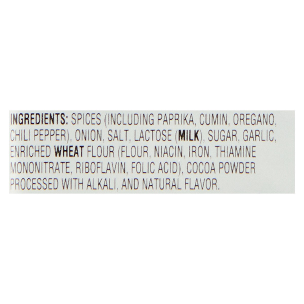 Spices (Including Paprika, Cumin, Oregano, Chili Pepper), Onion, Salt, Lactose (Milk), Sugar, Garlic, Enriched Wheat Flour (Flour, Niacin, Iron, Thiamine Mononitrate, Riboflavin, Folic Acid), Cocoa Po…