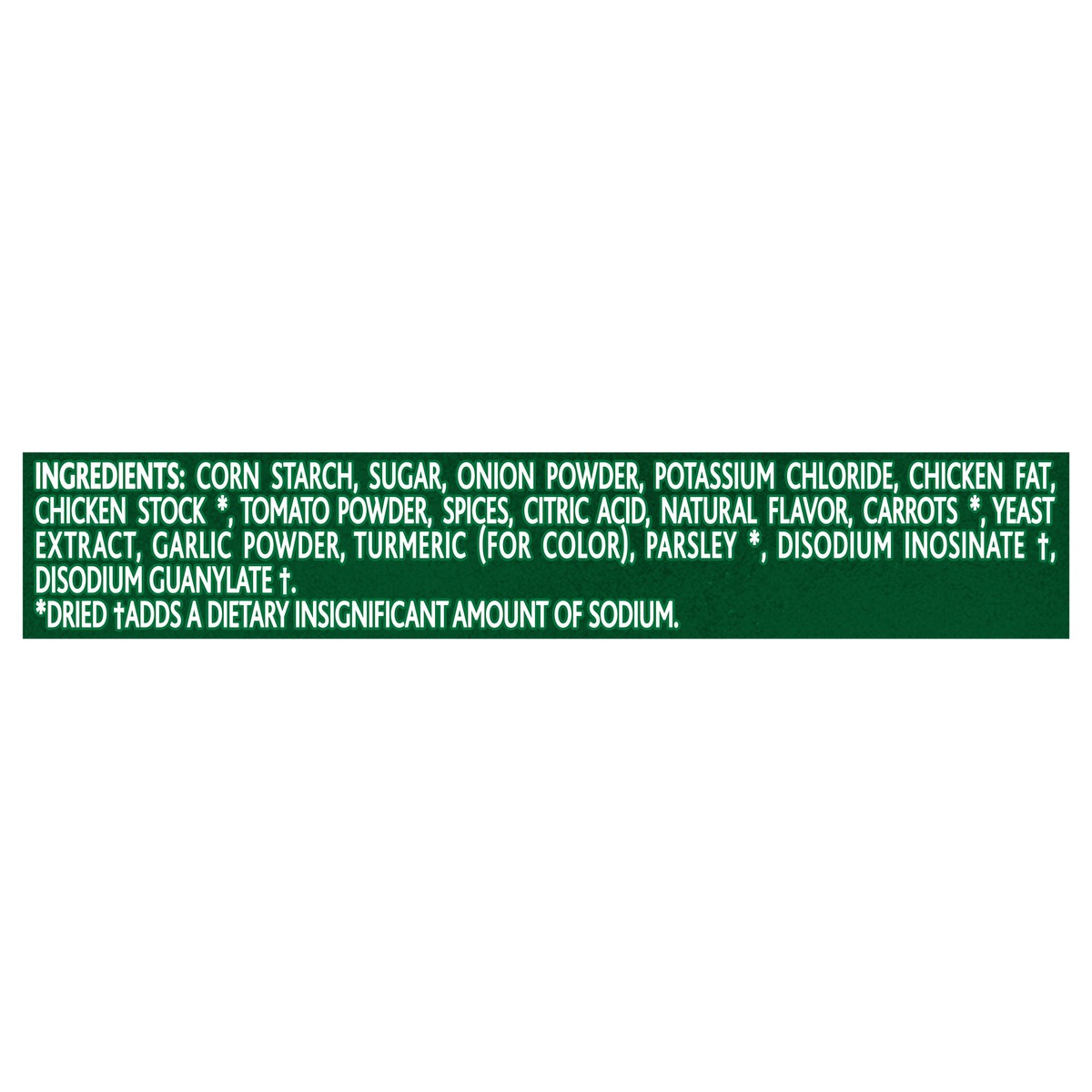 Corn Starch, Sugar, Onion Powder, Potassium Chloride, Chicken Fat, Chicken Stock (Dried), Tomato Powder, Spices, Citric Acid, Natural Flavor, Carrots (Dried), Yeast Extract, Garlic Powder, Turmeric (f…