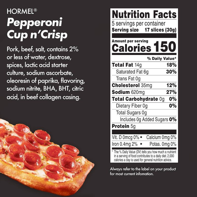 - Includes one 5oz resealable pack of ready-to-eat HORMEL Cup N' Crisp Pepperoni; Packaged for freshness