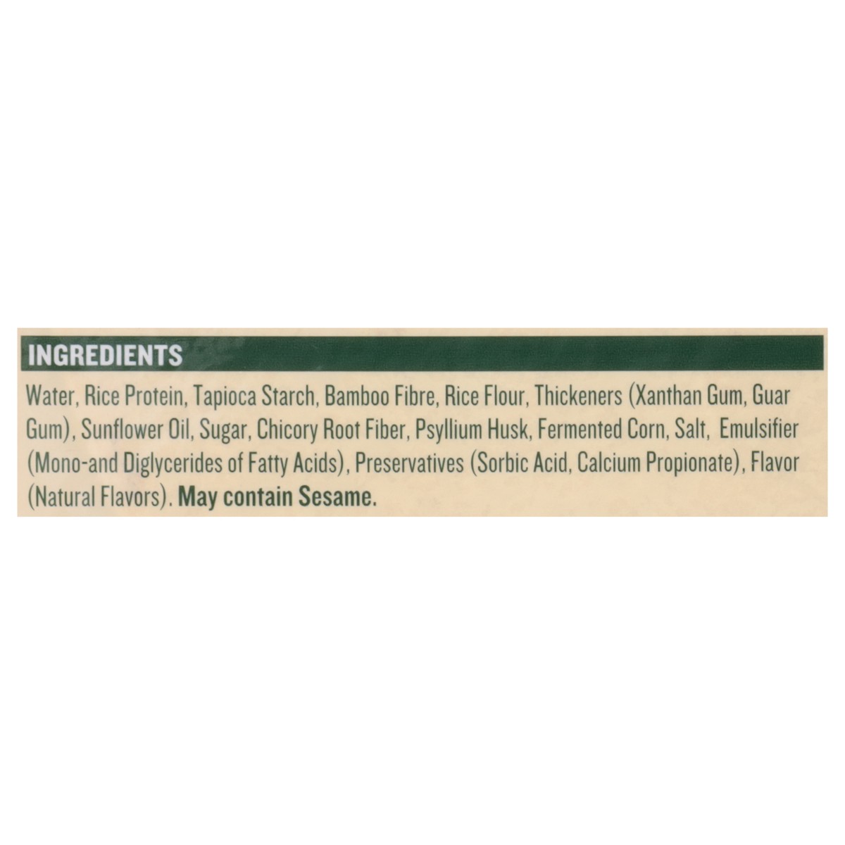 Water, Rice Protein, Tapioca Starch, Bamboo Fibre, Rice Flour, Thickeners (Xanthan Gum, Guar Gum), Sunflower Oil, Sugar, Chicory Root Fiber, Psyllium Husk, Fermented Corn, Salt, Emulsifier (Mono-and D…