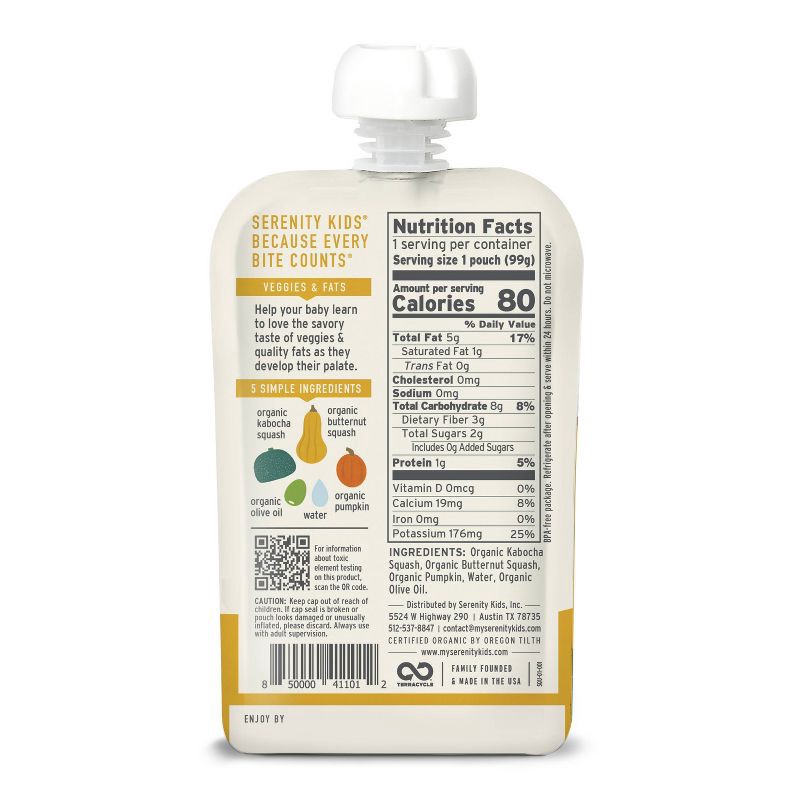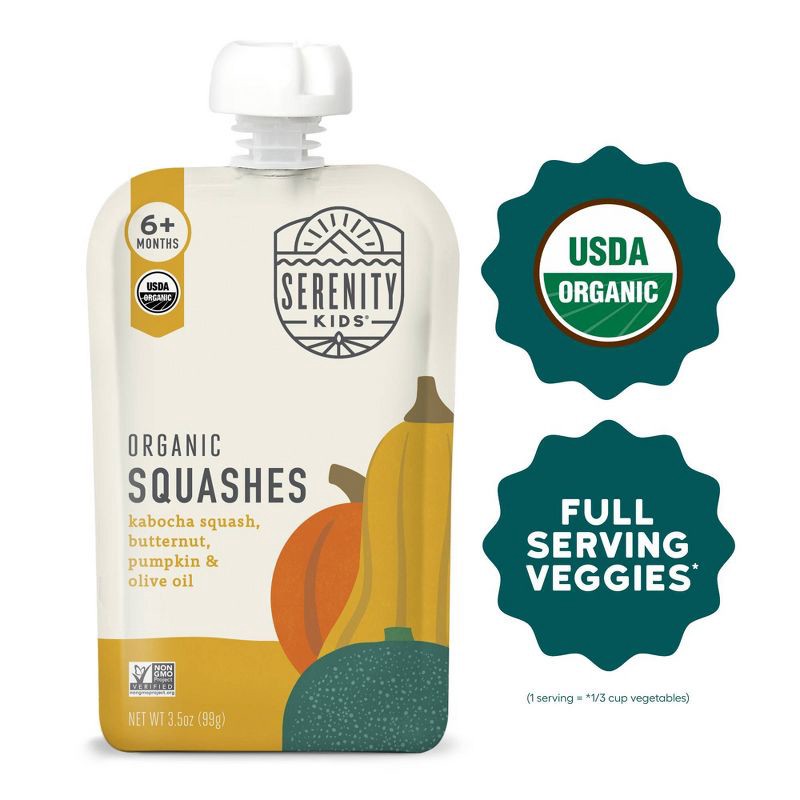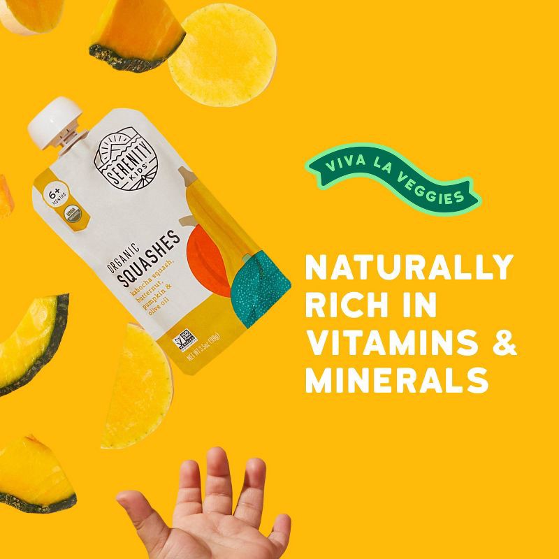Serenity Kids Organic Squashes with Organic Olive Oil Baby Food Pouch - 3.5oz: Stage 2 Pureed Meals, USDA Certified