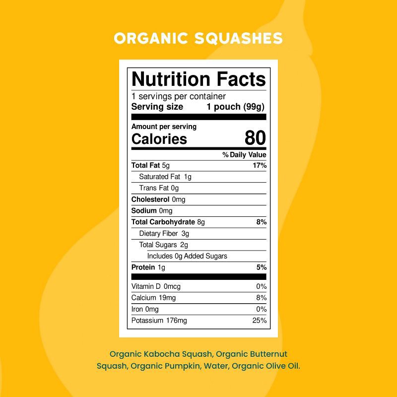 - Made with organic kabocha squash, butternut squash, pumpkin & olive oil