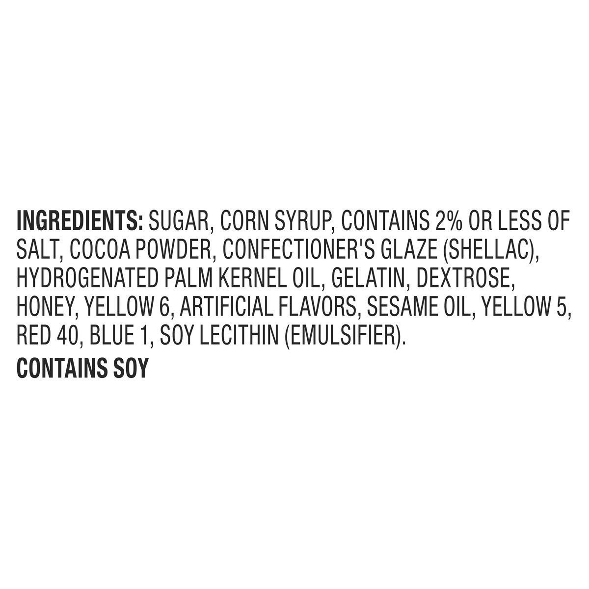 Sugar, Corn Syrup, Contains 2% or Less of Salt, Cocoa Powder, Confectioner's Glaze (Shellac), Hydrogenated Palm Kernel Oil, Gelatin, Dextrose, Honey, Yellow 6, Artificial Flavors, Sesame Oil, Yellow 5…