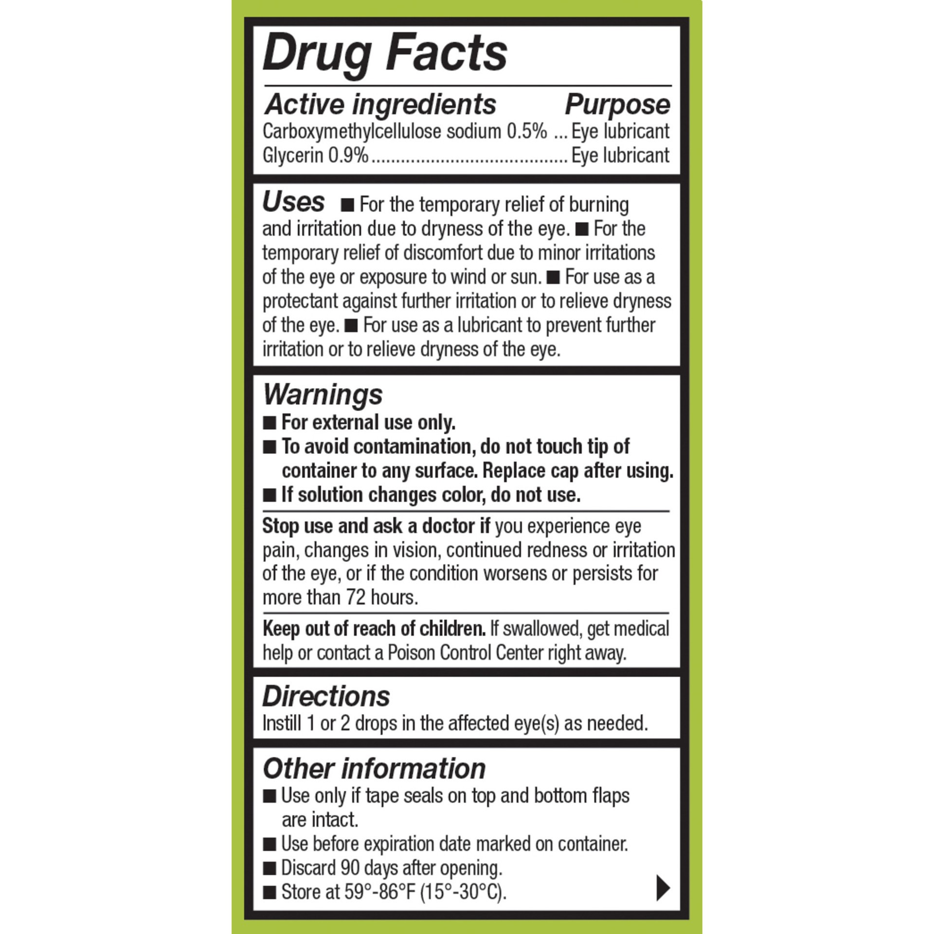 Carboxymethylcellulose sodium 0.5%, Glycerin 0.9%. Purpose: Eye lubricants.