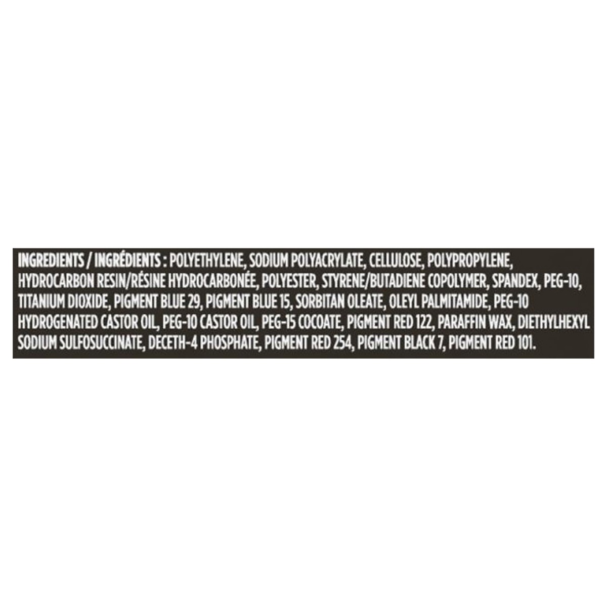 Polyethylene, Sodium Polyacrylate, Cellulose, Polypropylene, Hydrocarbon Resin/Resine Hydrocarbonee, Polyester, Styrene/Butadiene Copolymer, Spandex, PEG-10, Titanium Dioxide, Pigment Blue 29, Pigment…