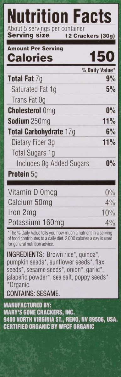 - Mary's Gone Crackers Super Seed Jalapeño Crackers contain 17g of whole grains and 5g of protein per serving.