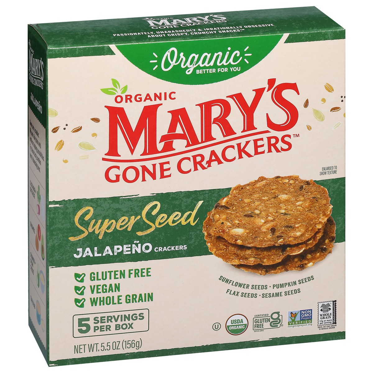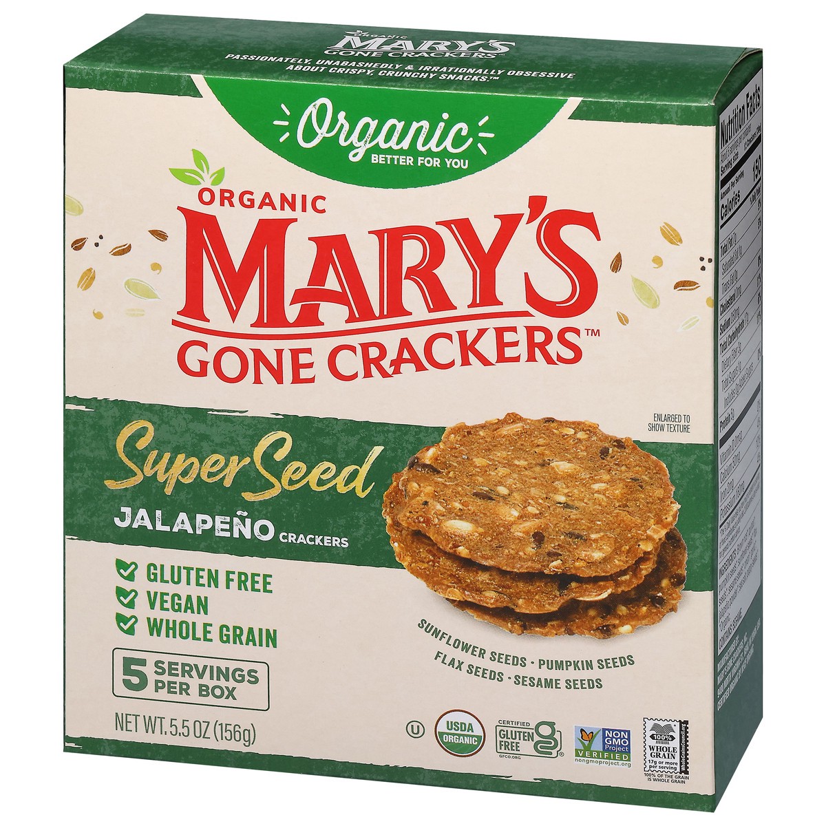 Mary’s Gone Crackers Super Seed Jalapeño Crackers combine nutrient-packed seeds with a spicy jalapeño kick. Made with organic, gluten-free brown rice, quinoa, and a mix of pumpkin, sunflower, flax, an…
