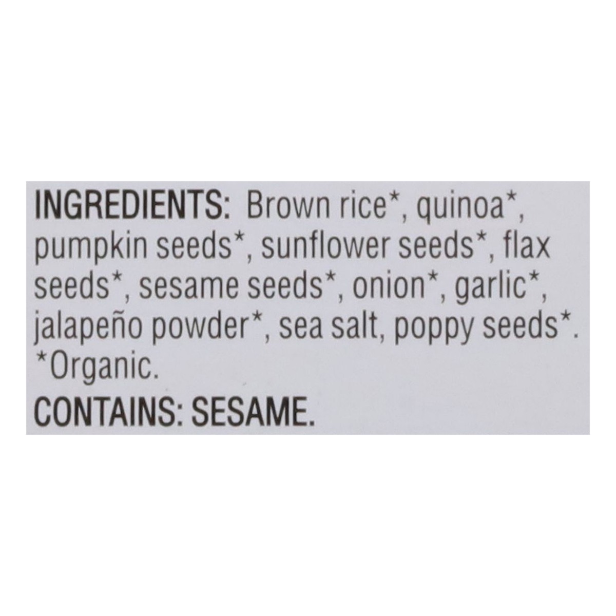 Brown Rice*, Quinoa*, Pumpkin Seeds*, Sunflower Seeds*, Flax Seeds*, Sesame Seeds*, Onion*, Garlic*, Jalapeno Powder*, Sea Salt, Poppy Seeds*. *Organic.