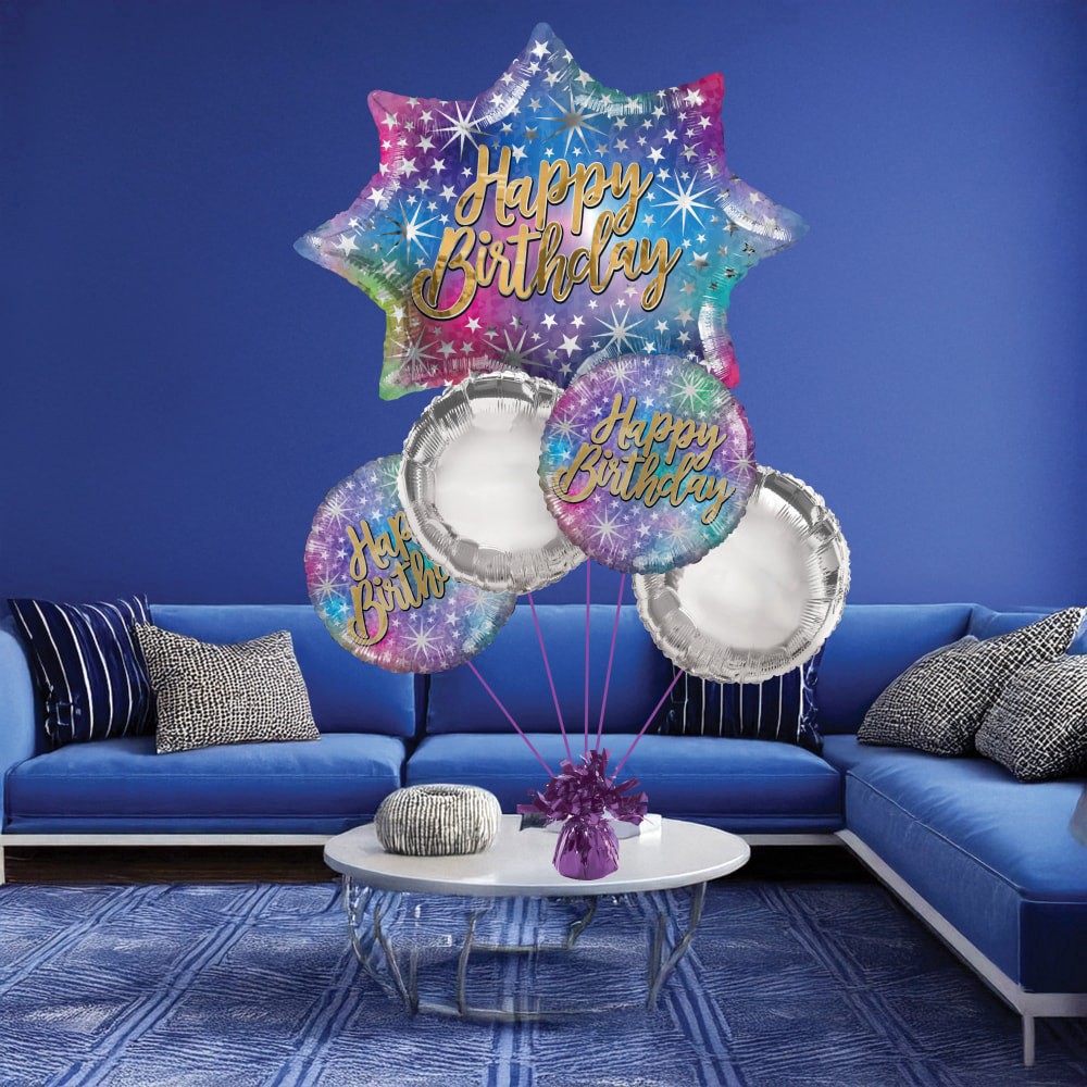 Add a little sparkle to your birthday with this star burst birthday balloon bouquet. This bouquet features a 28" oversized ombre star burst shape balloon with a Happy Birthday message, 2-17" coordinat…