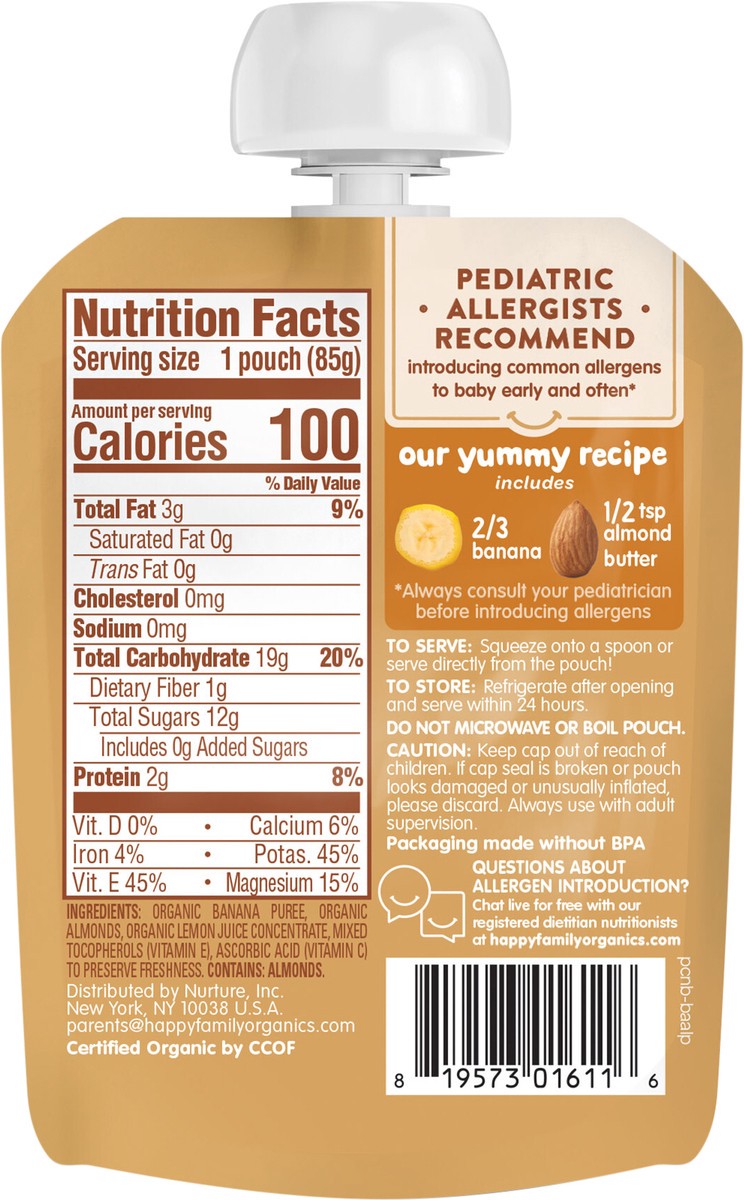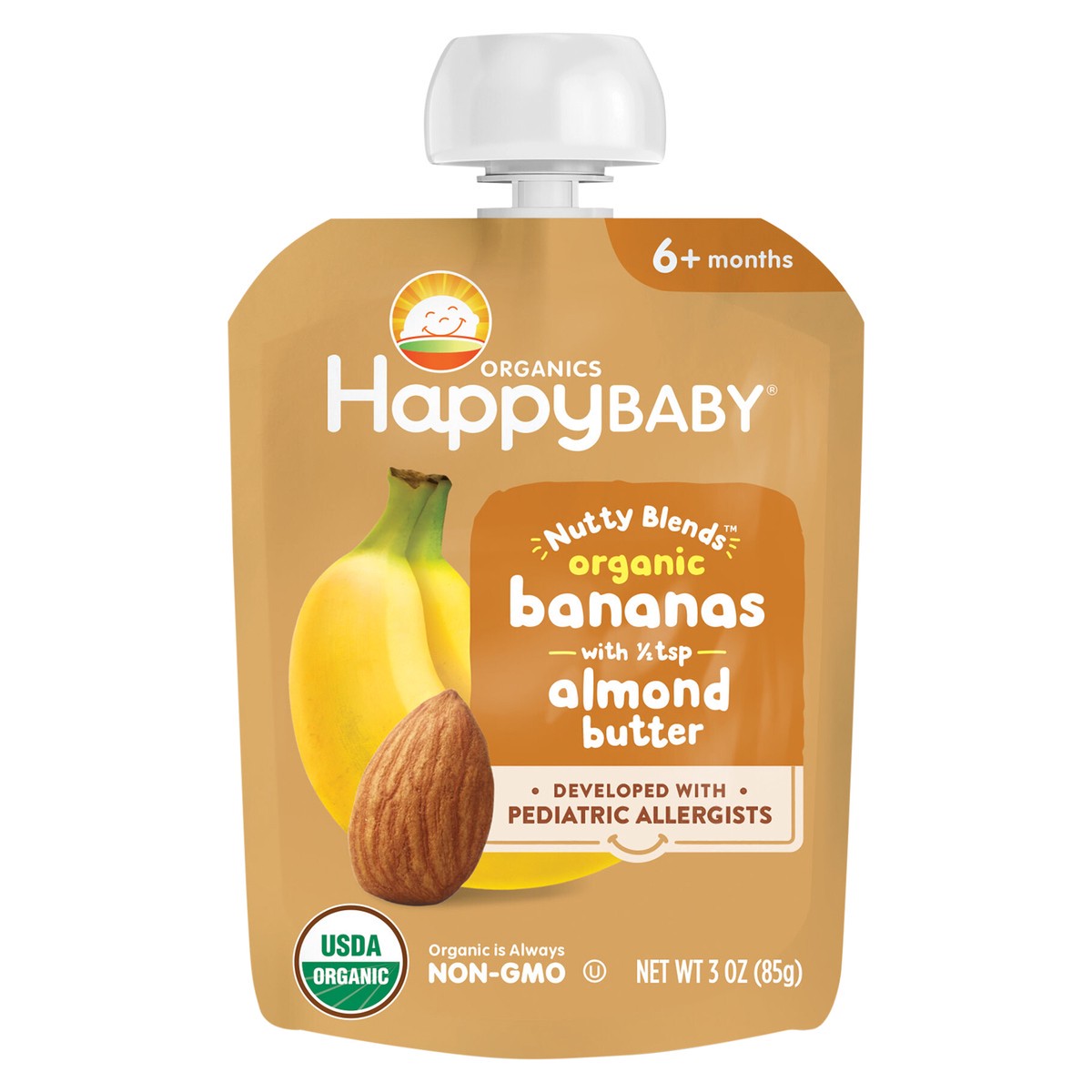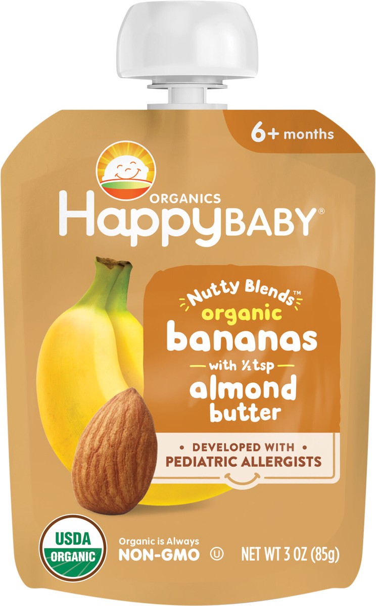 Happy Baby Organics Nutty Blends Stage 2, Bananas & Almond Butter, Allergen Introduction in Baby Appropriate Texture, for 6+ Months, 3 Oz