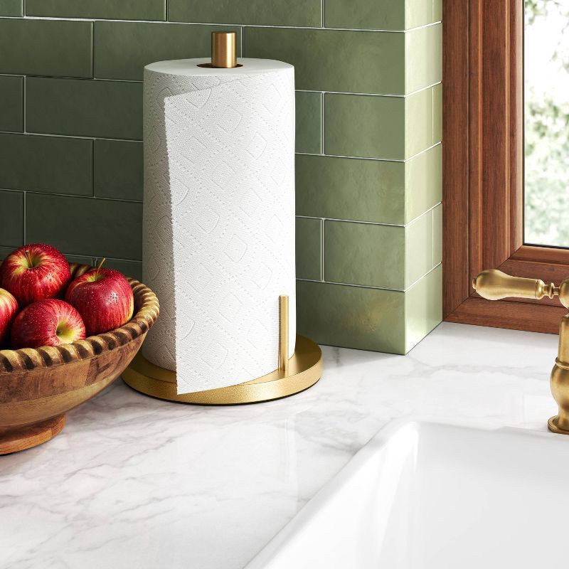 Elevate your kitchen space with this Paper Towel Holder from Threshold™. Made of metal, this paper towel holder features a long arm to insert the roll and small arm to hold loose end. The circular bas…
