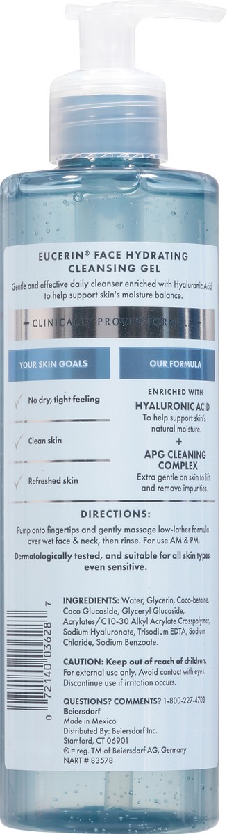 Eucerin Face Gentle Cleansing Hydrating Cleansing Gel is a gentle, effective facial cleanser enriched with Hyaluronic Acid to help support the skin''s moisture balance. Formulated with APG Cleansing C…