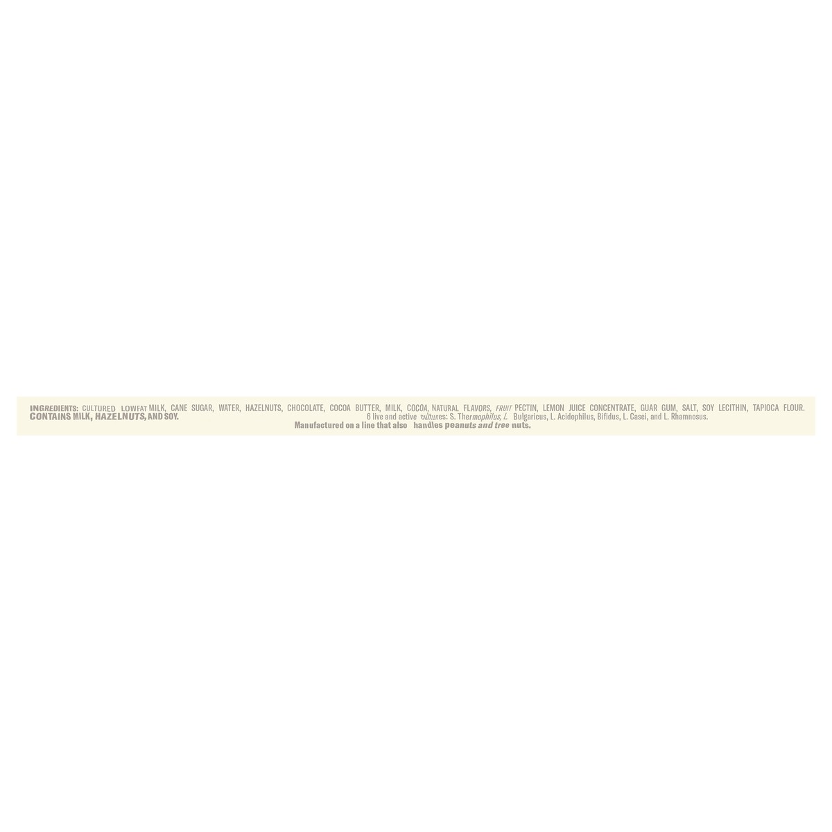 Cultured Lowfat Milk, Cane Sugar, Water, Hazelnuts, Chocolate, Cocoa Butter, Milk, Natural Flavors,, Fruit Pectin, Lemon Juice Concentrate, Guar, Salt, Soy, Lecithin, Tapioca Flour, 6 Live and Active …