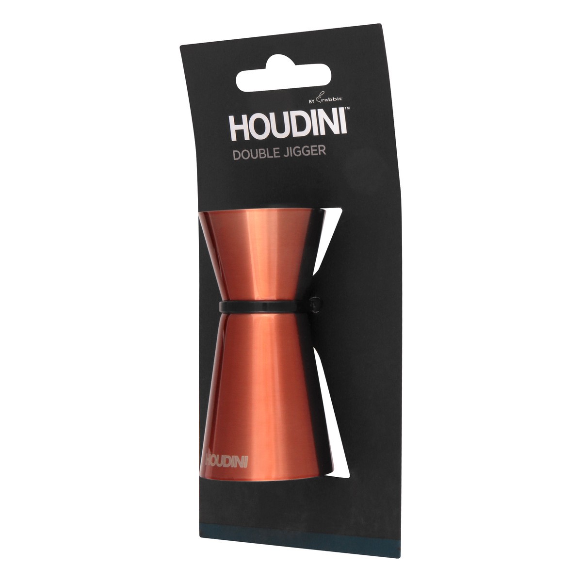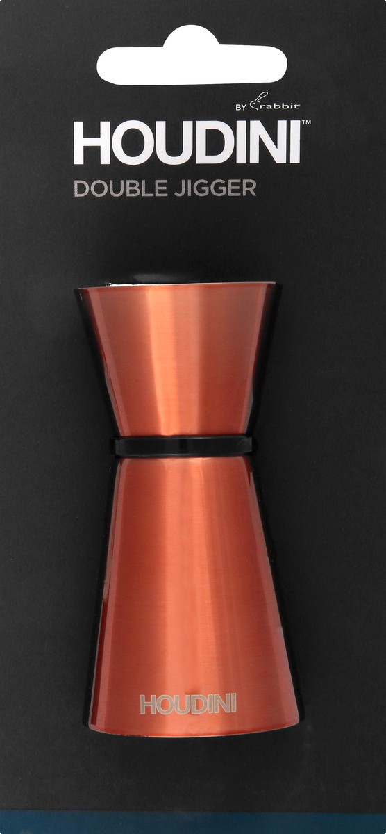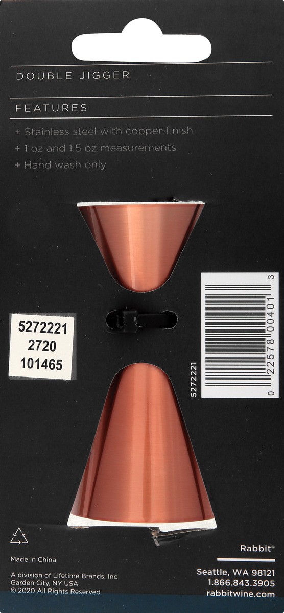 Features: Stainless steel with copper finish. 1 oz and 1.5 oz measurements. Hand wash only. rabbitwine.com. Made in China.