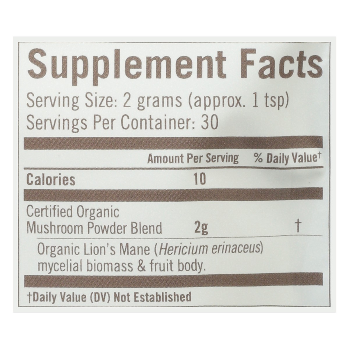 Certified Organic Mushroom Powder Blend: Organic Lion's Mane (Hericium Erinaceus) Mycelial Biomass & Fruit Body. Other Ingredients: Organic Myceliated Oats