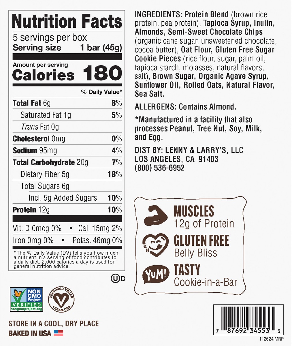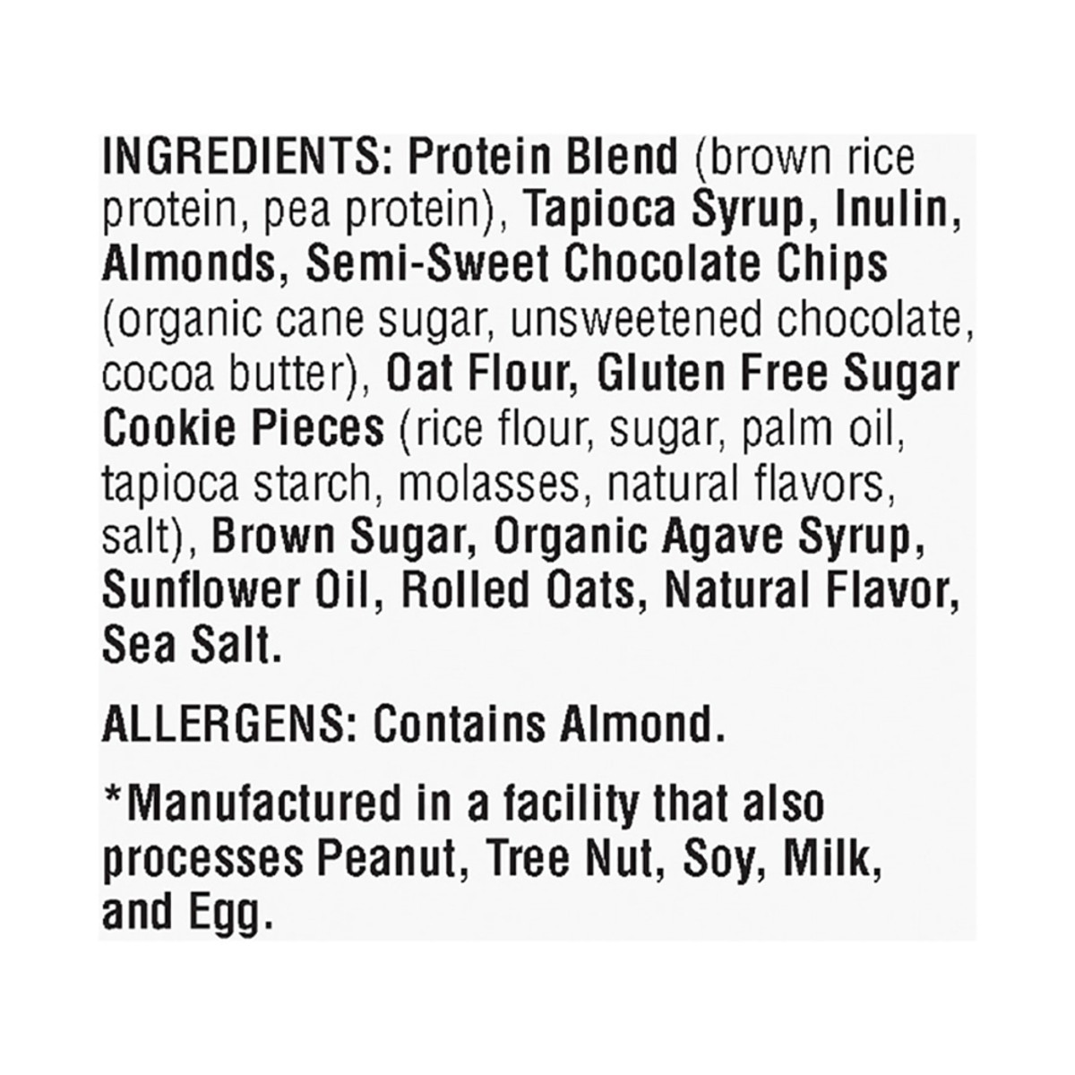 Protein Blend (Brown Rice Protein, Pea Protein), Tapioca Syrup, Inulin, Almonds, Semi-Sweet Chocolate Chips (Organic Cane Sugar, Unsweetened Chocolate, Cocoa Butter), Oat Flour, Gluten Free Sugar Cook…
