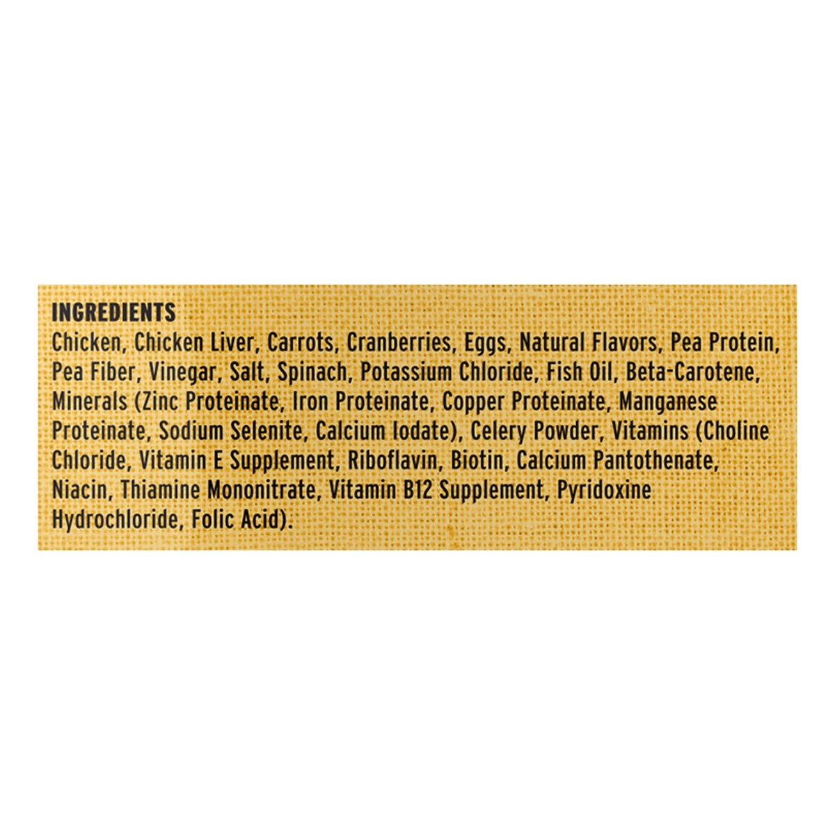 Chicken, Chicken Liver, Carrots, Cranberries, Eggs, Natural Flavors, Pea Protein, Pea Fiber, Vinegar, Salt, Spinach, Potassium Chloride, Fish Oil, Beta-Carotene, Minerals (Zinc Proteinate, Iron Protei…