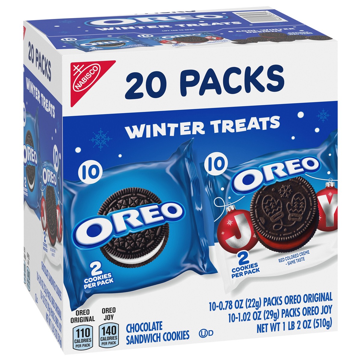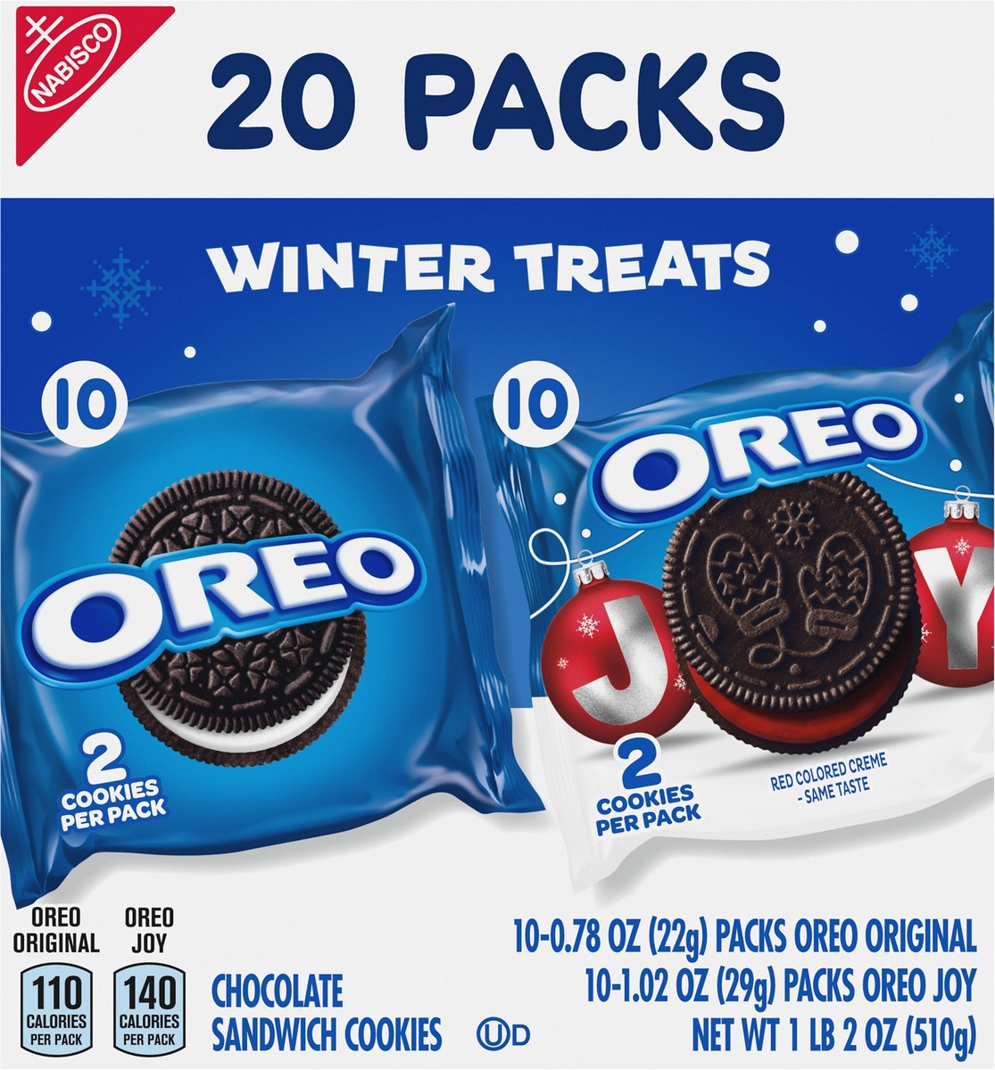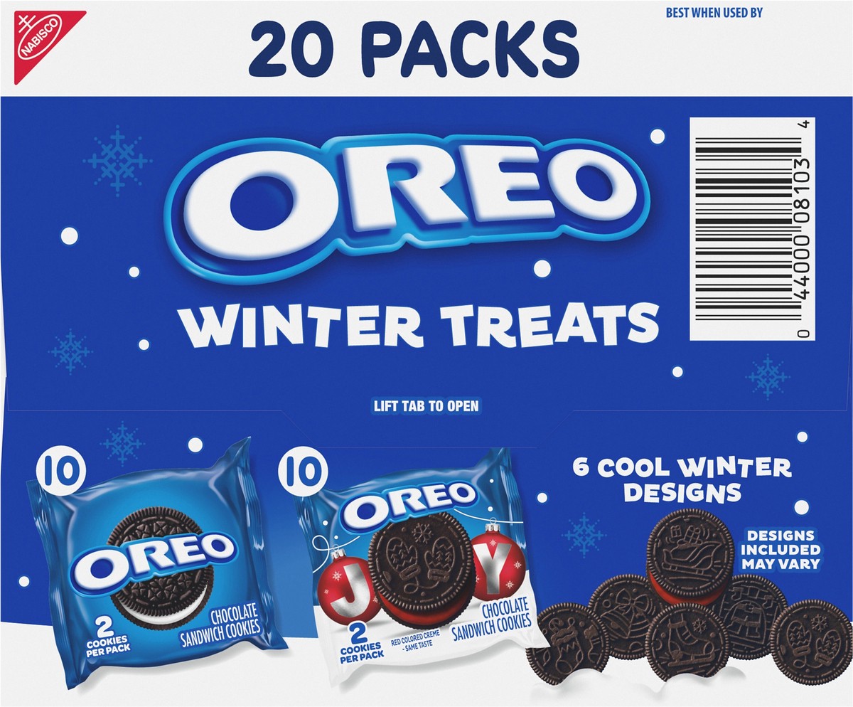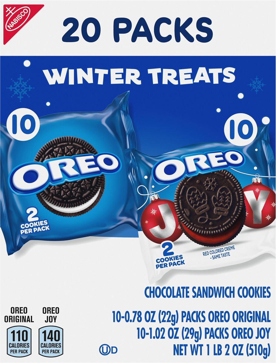 - Each box contains 10 original OREO cookies and 10 OREO Red Creme holiday cookie snack packs with six festive designs