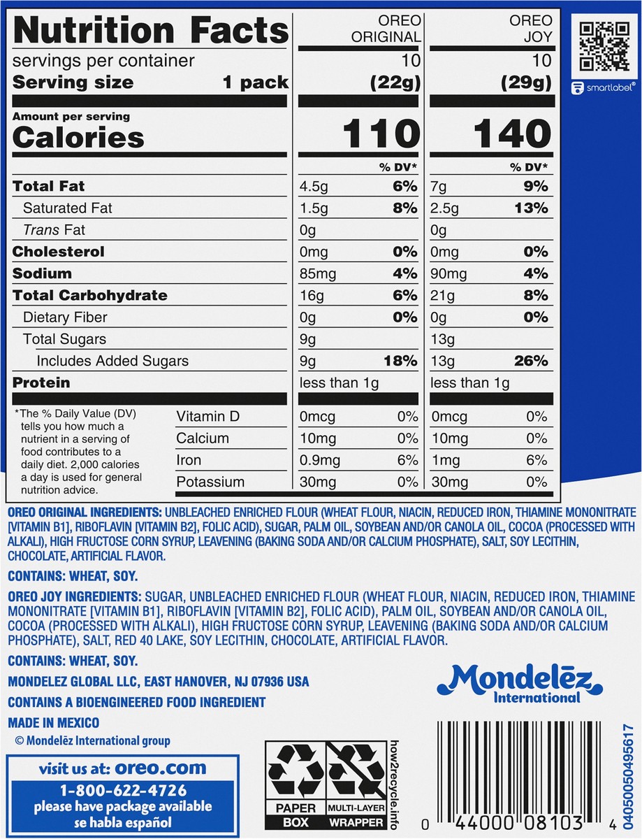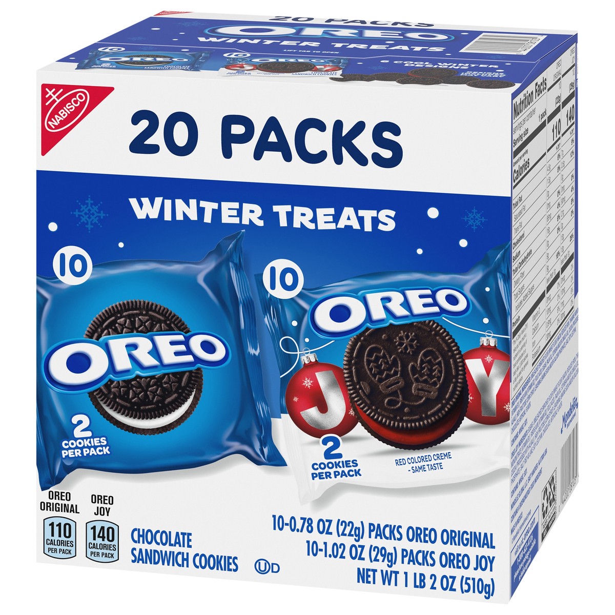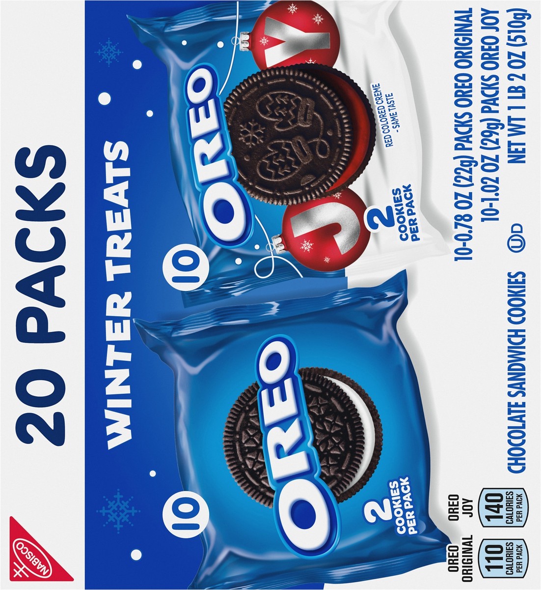 - Each box contains 10 original OREO cookies and 10 OREO Red Creme holiday cookie snack packs with six festive designs