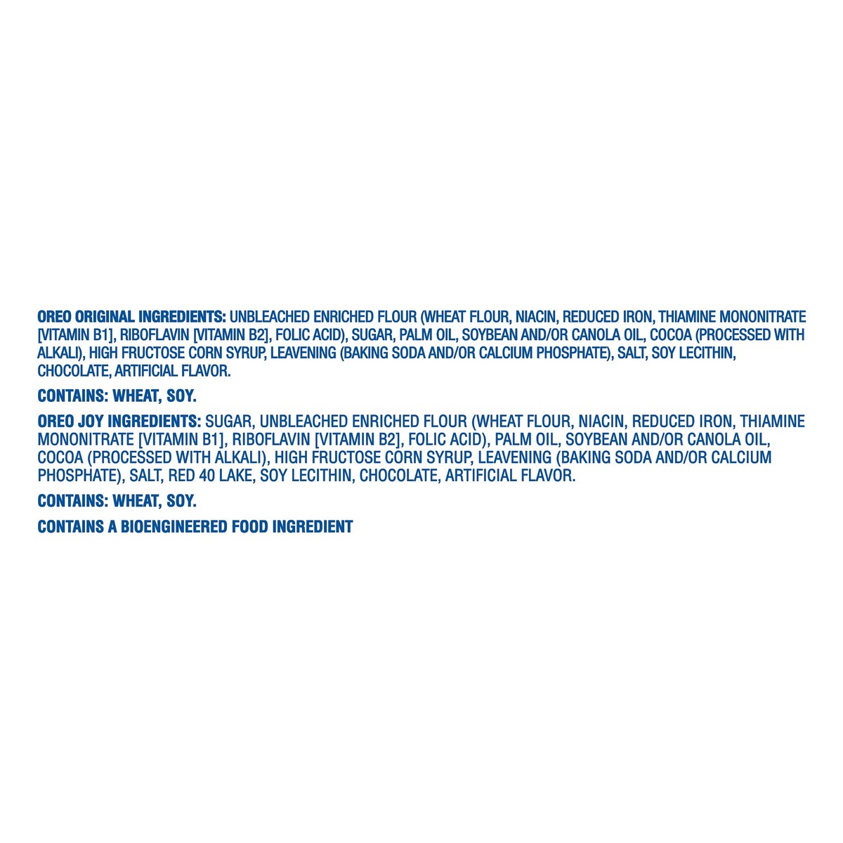 Oreo Original: Unbleached Enriched Flour (Wheat Flour, Niacin, Reduced Iron, Thiamine Mononitrate [Vitamin B1], Riboflavin [Vitamin B2], Folic Acid), Sugar, Palm Oil, Soybean and/or Canola Oil, Cocoa …