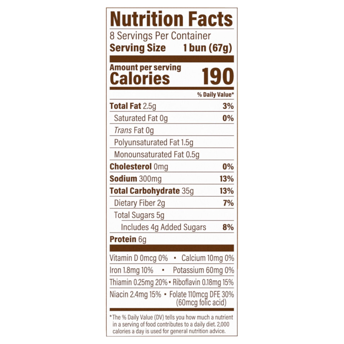 Always baked without artificial flavors & preservatives. Per 1 Bun Serving: 190 Calories; 0 g sat fat (0% DV); 300 mg sodium (13% DV); 4 g added sugars (8% DV). New! how2recycle.info. SmartLabel: Scan…