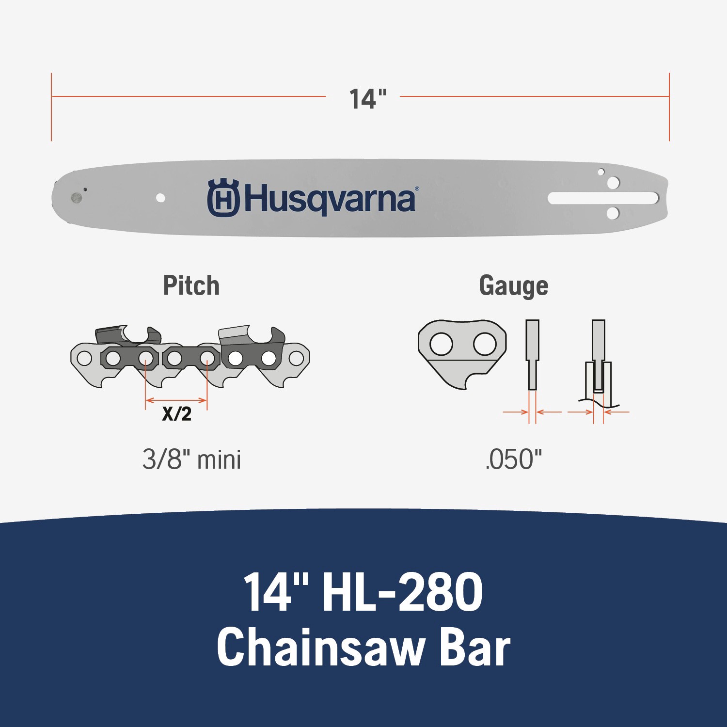 Includes one Husqvarna HL280 14 Inch Chainsaw Bar for models: 240, 120 MARK II, 130, 135 MARK II, 439, T435, T540XP. 14 inch chainsaw bar features a 3/8" mini pitch, .050" gauge and 52 drive links. Th…