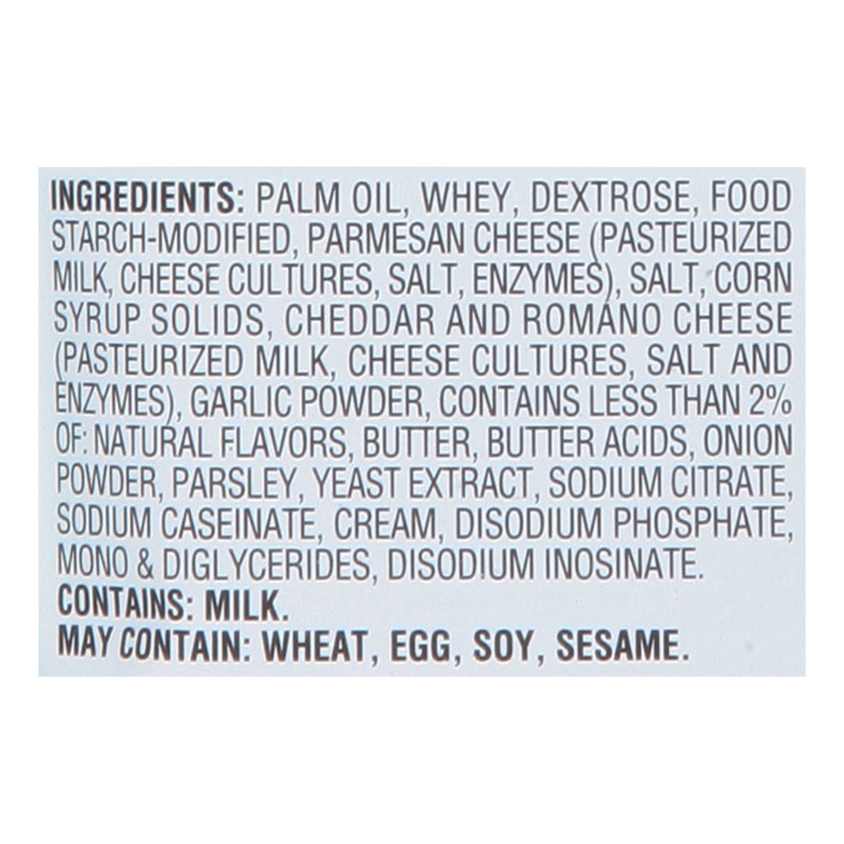 Palm Oil, Whey, Dextrose, Food Starch-Modified, Parmesan Cheese (Pasteurized Milk, Cheese Cultures, Salt, Enzymes), Salt, Corn Syrup Solids, Cheddar and Romano Cheese (Pasteurized Milk, Cheese Culture…
