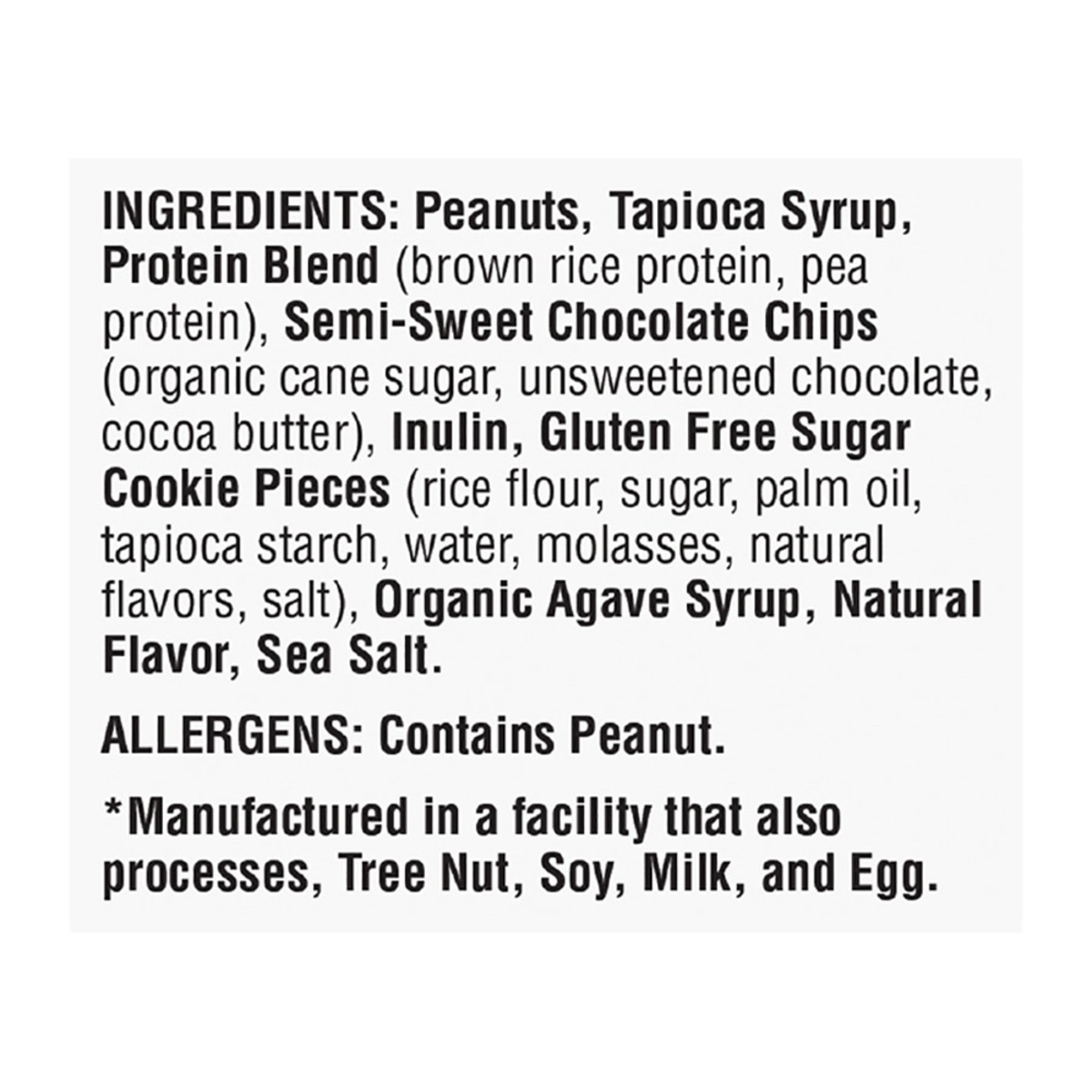Peanuts, Tapioca Syrup, Protein Blend (Brown Rice Protein, Pea Protein), Semi-Sweet Chocolate Chips (Organic Cane Sugar, Unsweetened Chocolate, Cocoa Butter), Inulin, Gluten Free Sugar Cookie Pieces (…