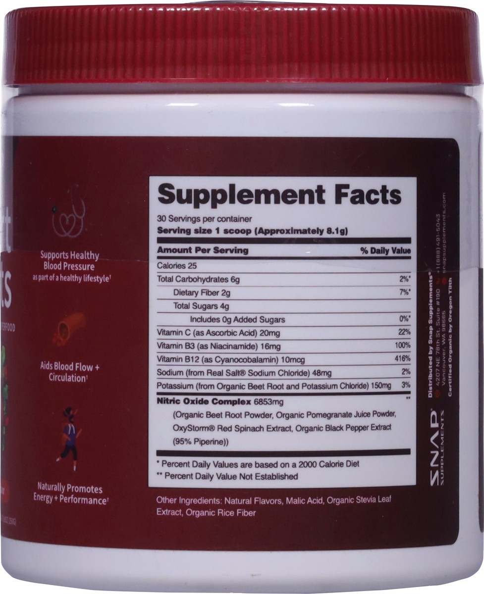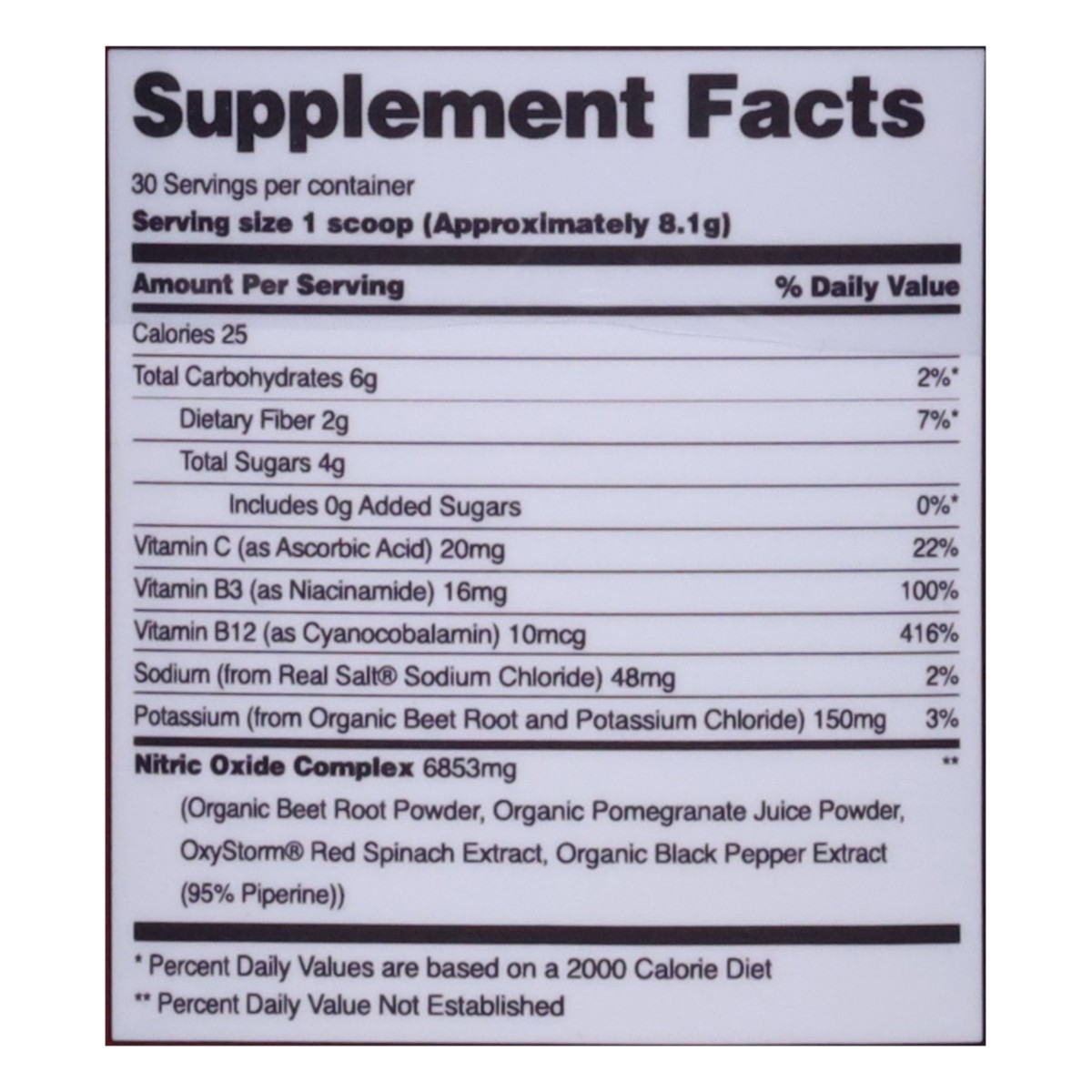 Nitric Oxide Complex: (Organic Beet Root Powder, Organic Pomegranate Juice Powder, Oxystorm Red Spinach Extract, Organic Black Pepper Extract (95% Piperine)). Other Ingredients: Natural Flavors, Malic…