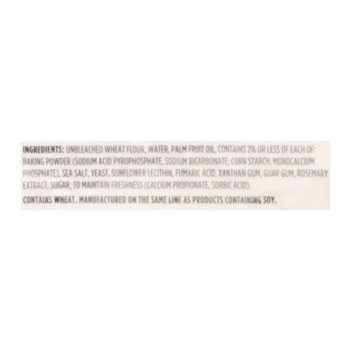 Unbleached Wheat Flour, Water, Palm Fruit Oil, Contains 2% or Less of Each of Baking Powder (Sodium Acid Pyrophosphate, Sodium Bicarbonate, Corn Starch, Monocalcium Phosphate), Sea Salt, Yeast, Sunflo…